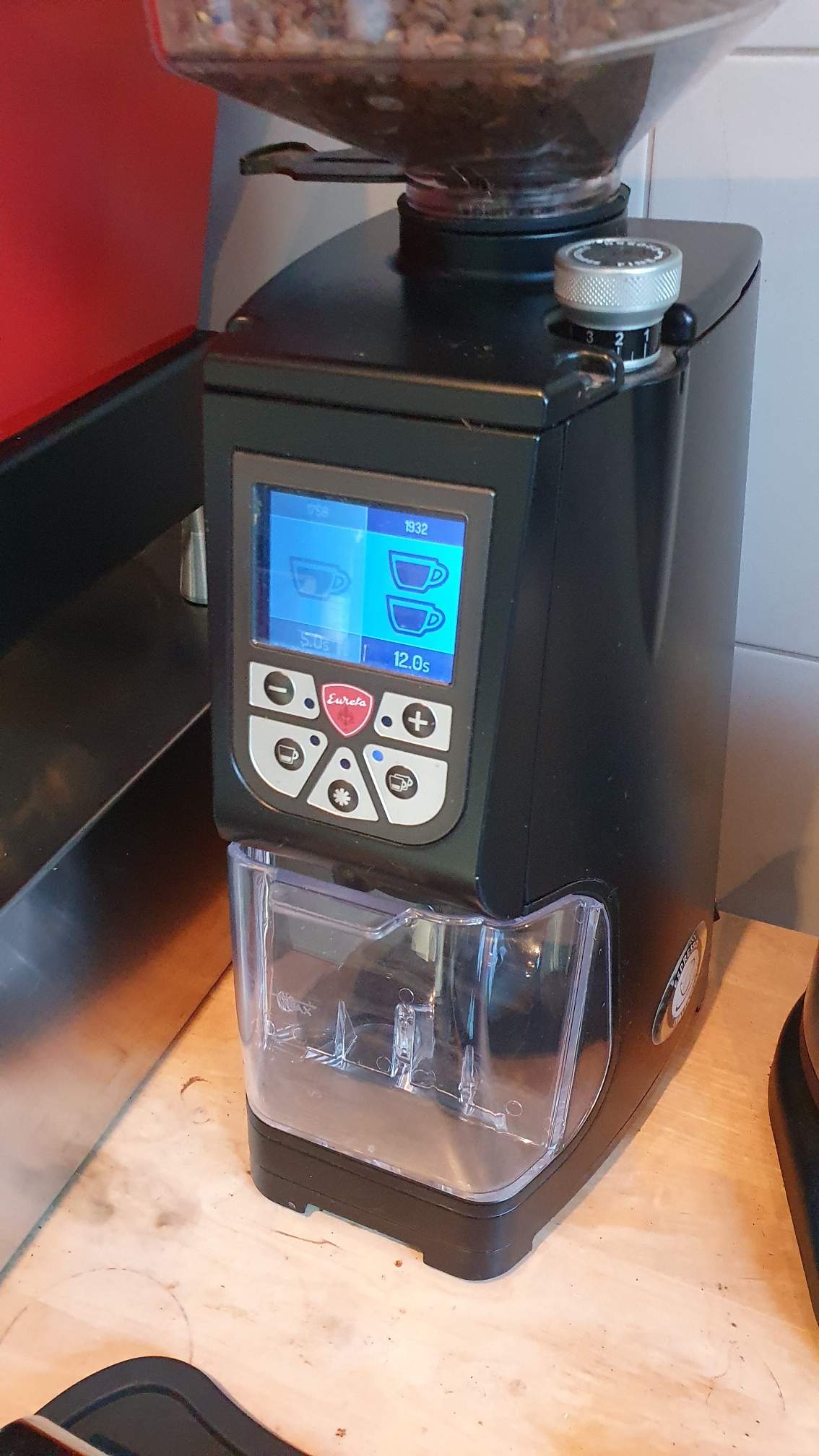 Zoals te zien op de foto's 1758 (5 sec) kleine doses en 1932 (12 sec) grote doses er doorheen gemalen. De kleine voor het leeg malen voor het 1e kopje, en bijstellen maling. De grote deed ik typisch 18 à 19 gram koffie mee. Een grove schatting zou dus zijn dat incl. handmatig aan/uit er zo'n 55 à 60kg aan bonen mee gemalen is.