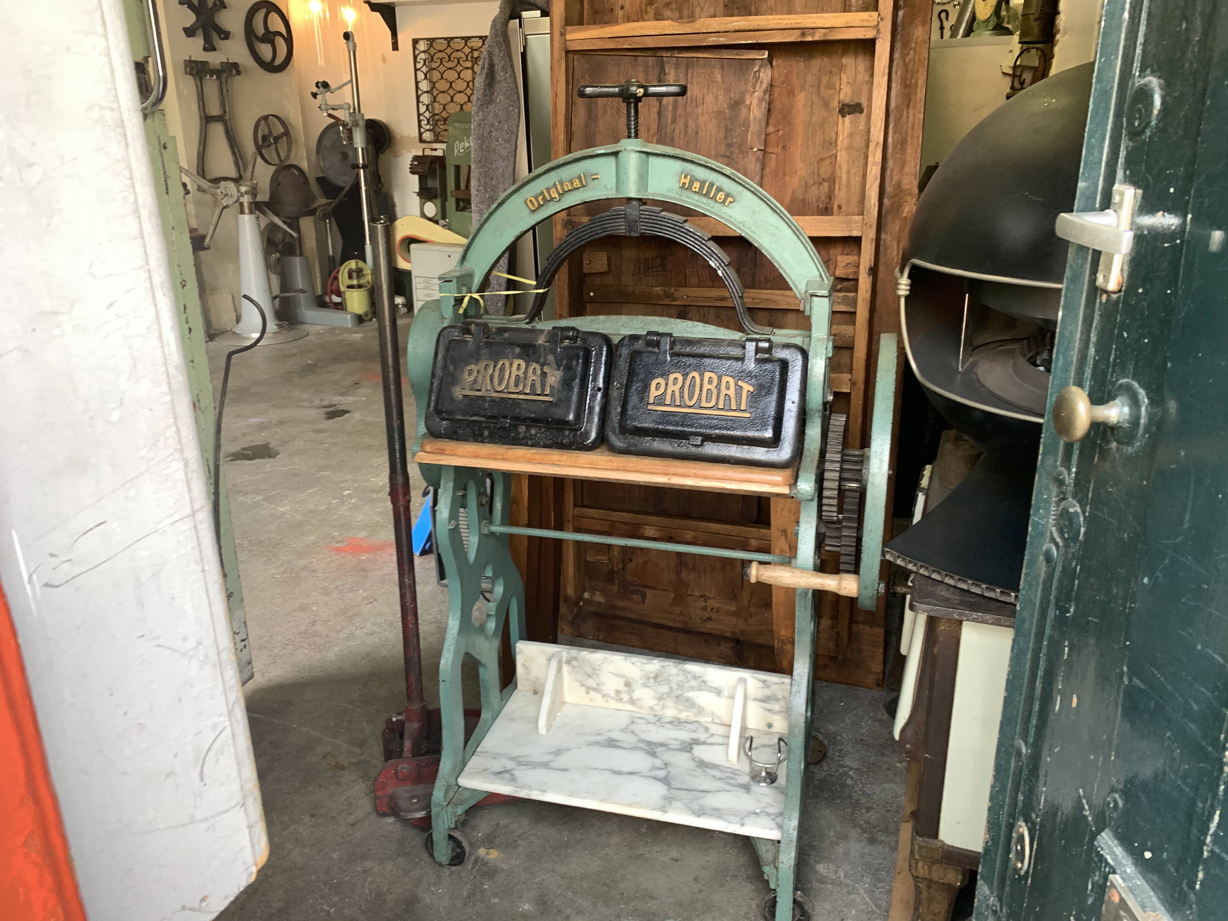 Probat maakte veel meer dan branders, dit lijken luiken van een oven, ze hebben ook glazen voorraad (toonbank grijpbussen) gemaakt, dat groene ding waar ze op liggen is een mangel voor in een groot huishouden, veel wassen en drogen.