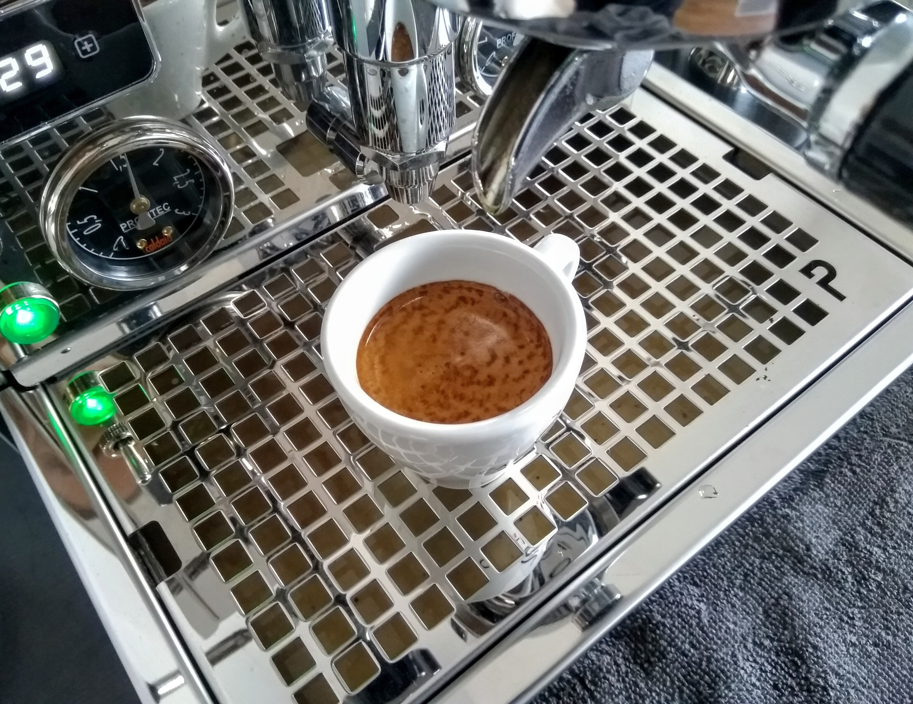 Het gaat mij steeds beter af, het maken van een espresso. Ben nu een paar weken bezig met m'n nieuwe setje, dus er is nog veel ruimte voor progressie.