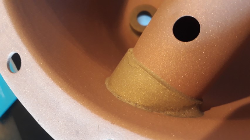 De gestraalde onderdelen zijn op zichzelf al kleine kunstwerkjes (kijk bijvoorbeeld naar het messing hardsoldeer). Helaas ga ik de manometer-cover, het aluminium afvoerputje en de brander spuiten met alu-Hammerite om ze te beschermen tegen corrosie. De boiler was voor mij ook een moment van "verlichting"....Er zijn nog wel eens restauraties te vinden waar uit blijkt dat het messing soldeerwerk van de HX geschuurd is... :(