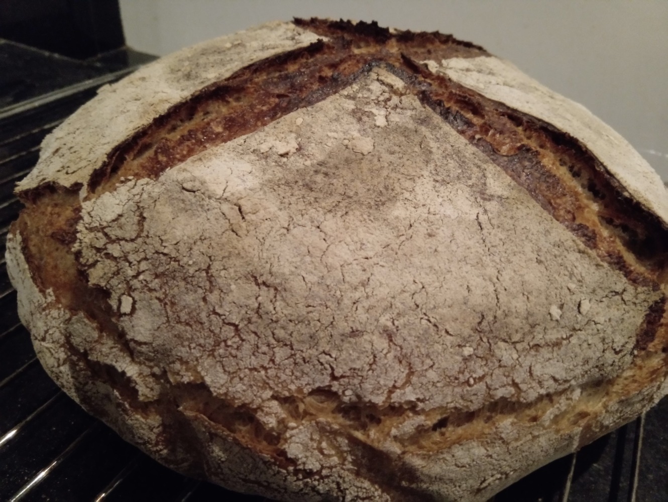 Deze vd week nog gemaakt. Met 50% versgemalen tarwe en iets van 10% versgemalen rogge, de rest goedkope bloem. Is 78% hydratatie.