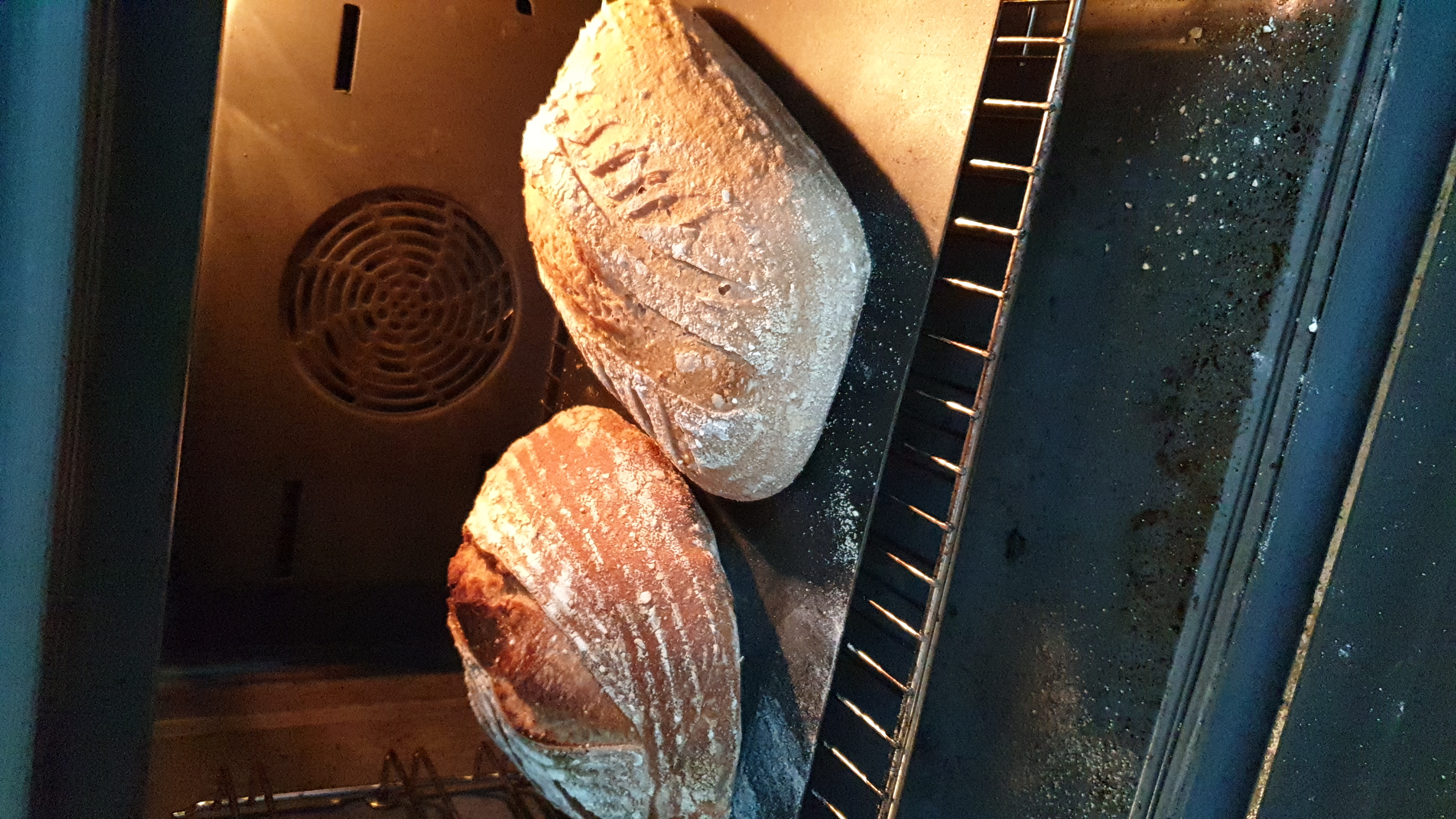 Het linker brood on afgedekt in de oven, wel bakje water en spray tegen de binnenkant van de oven, de rechter eerste 20 min afgedekt en daarna open in de oven. Zelfde deeg, zelfde fermentatie tijd etc. De nacht in de koelkast geweest, volgende ochtend de oven in.