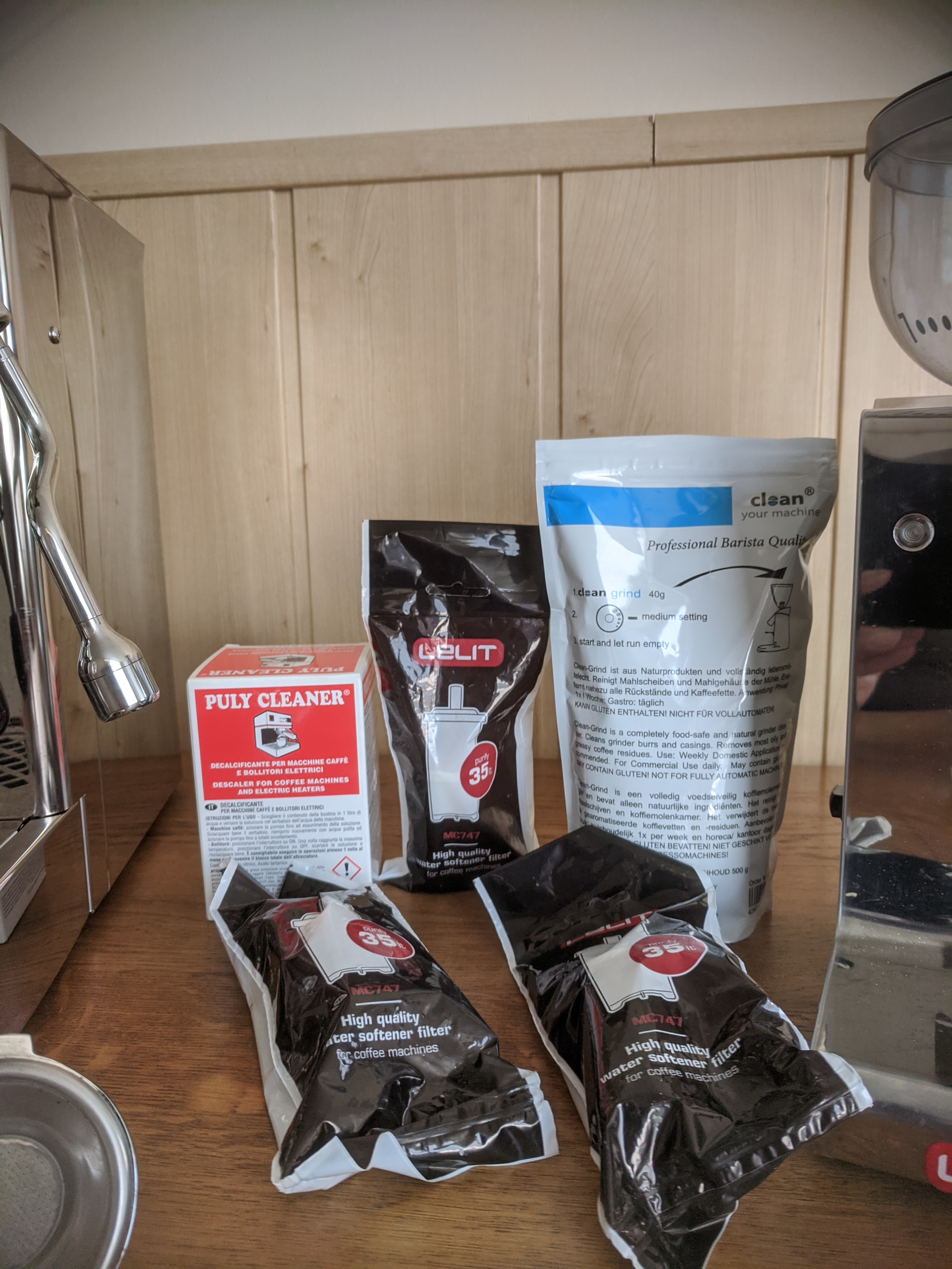 plus alle toebehoren: tamperstation (lelit), afklopbak (lelit), 3 waterfilters (lelit), melkkan, borsteltjes, shotglas, vloeistofthermometer en reinigingsartikelen.