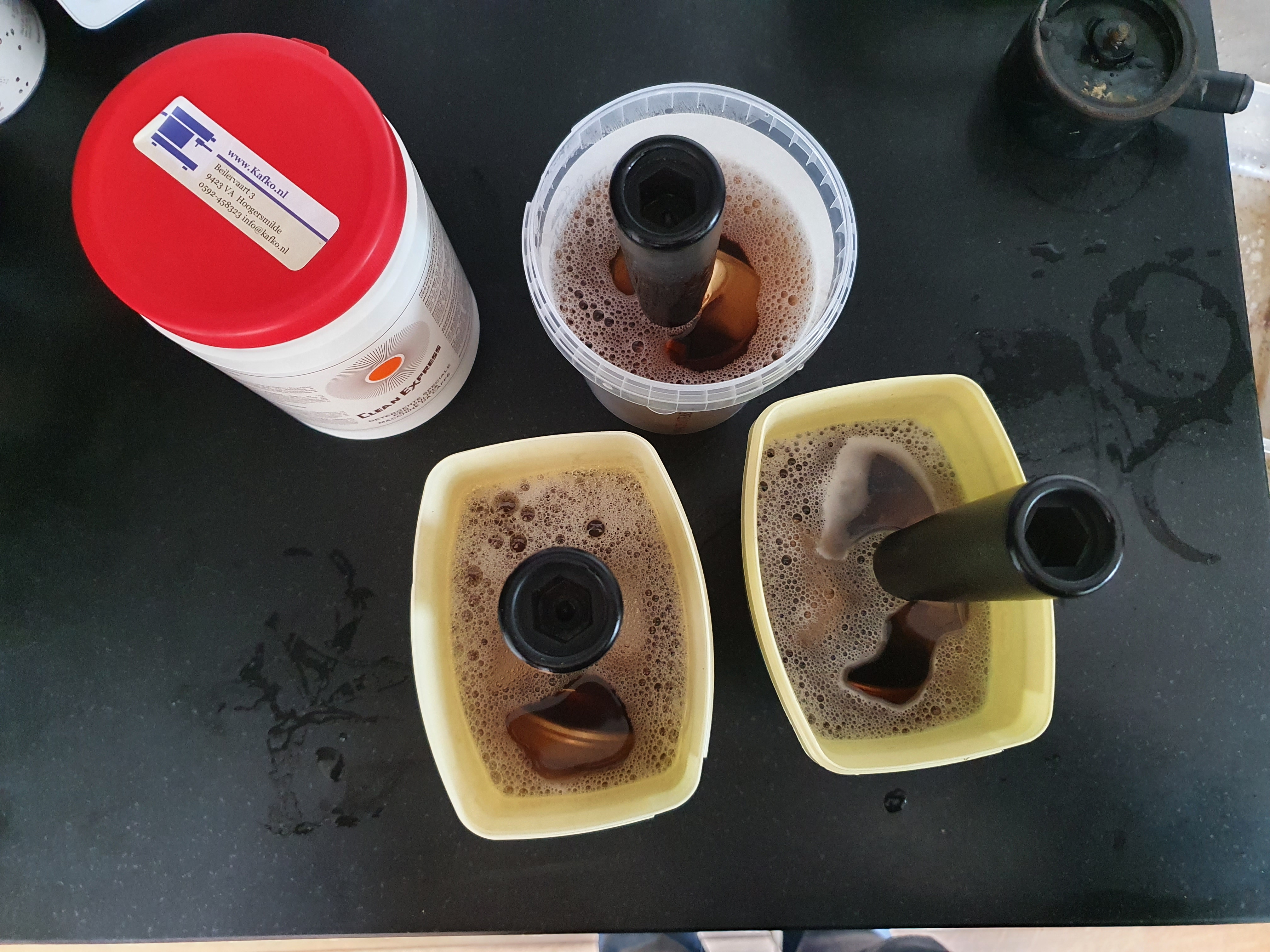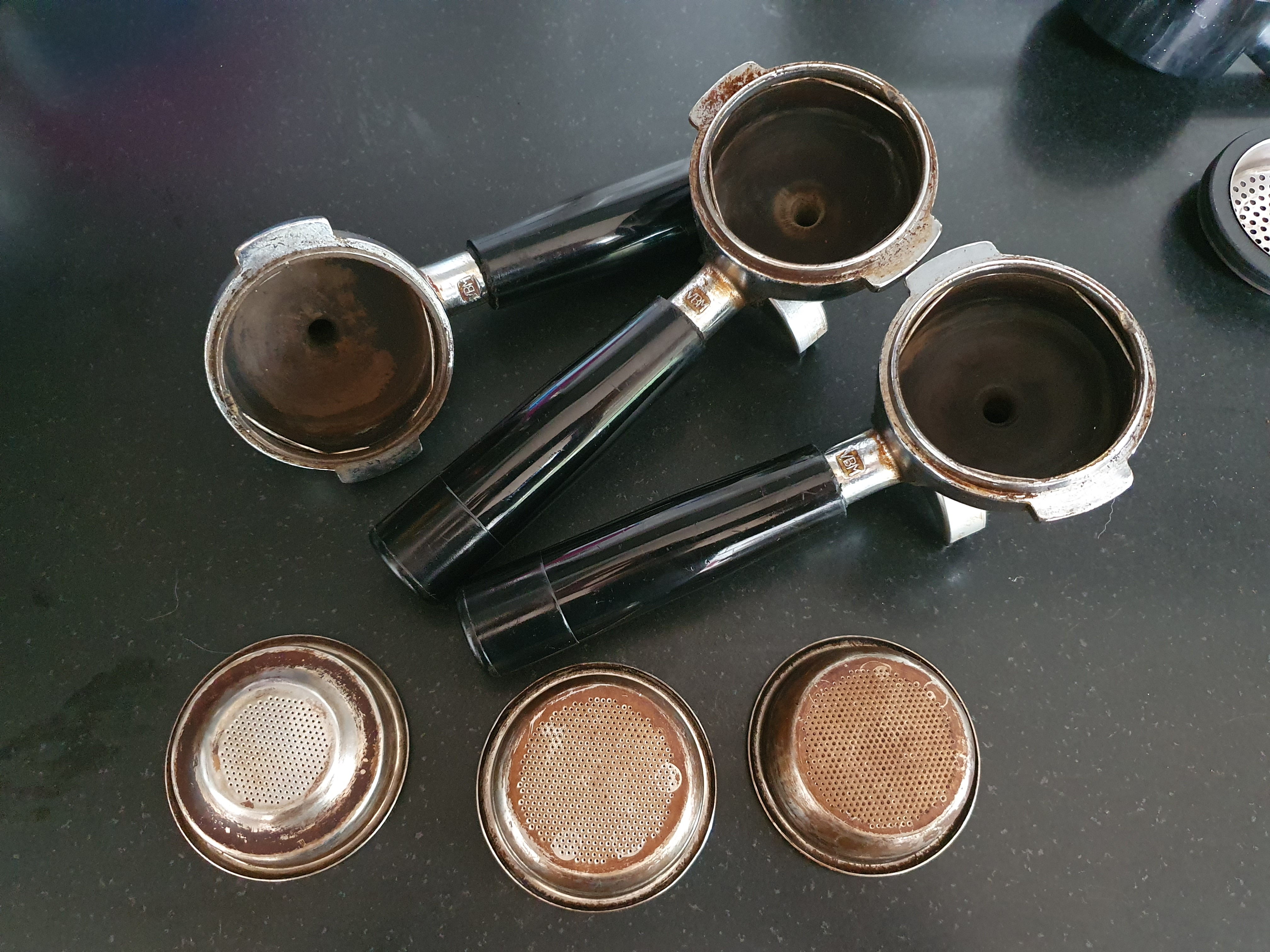 Allereerst eens de machine zelf Eerste stap (om even simpel te beginnen) was de portafilters schoonmaken want die waren behoorlkijk smerig Toen de machine zelf, de groepen volledig uit elkaar gehaald en schoongemaakt, waarbij bleek dat redelijk recent volgens mij wel netjes ringen, douchescherm etc. vervangen waren, maar tegelijkertijd ook schoonmaken, nee, dat was dan schijnbaar iets teveel. Dus veel gepoets, maar de onderdelen waren nog in prima staat.