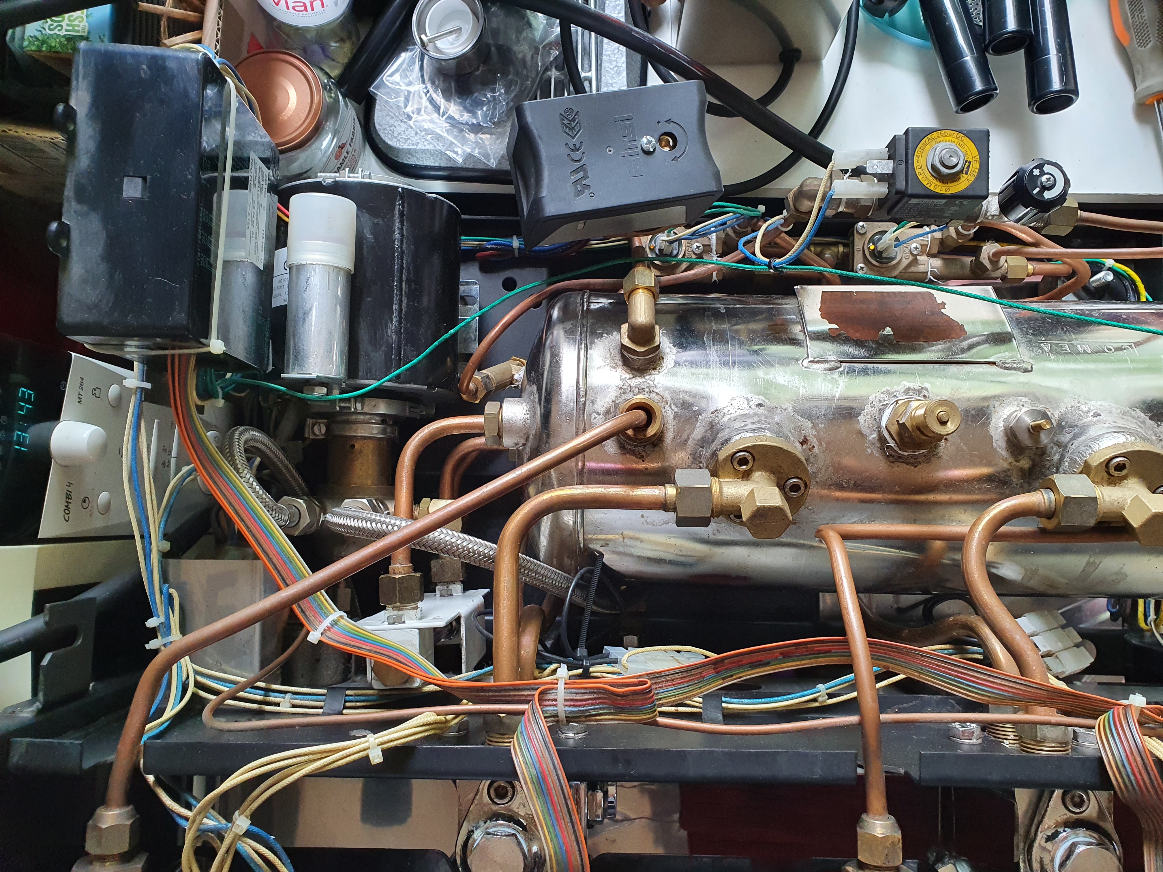 Toen even pauze, maar... ik dacht, waarom niet nog een espresso machine, is toch leuk om ze uit elkaar te halen en weer in elkaar te zetten. Toen kwam ik een Vibiemme Mercury tegen en voordat ik het wist stond deze thuis in de bijkeuken. Oeps... dat is toch wel heel wat anders als La Peppina. Groot, zwaar, veel leidingen en verbindingen etc., flink buiten mijn comfortzone, maar een mooie uitdaging :lol: