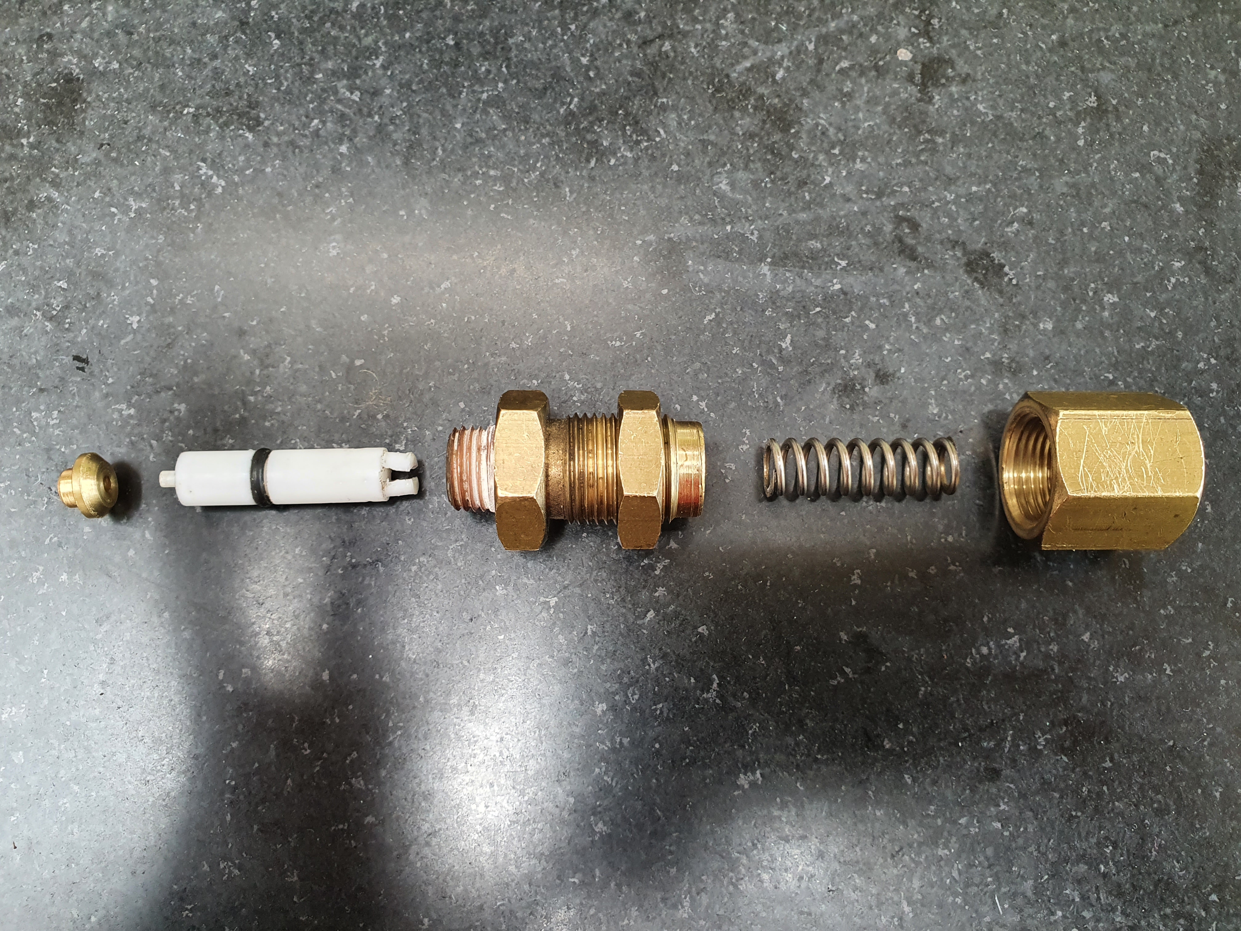 Als ik dan de pomp inkijk, ziet dat er zo uit En de relieve valve zelf viel me uit de handen, dus dat waren wat onderdelen. Met even puzzelen kwam ik tot de conclusie dat die logischerwijs op 2 manieren weer in elkaar zou kunnen