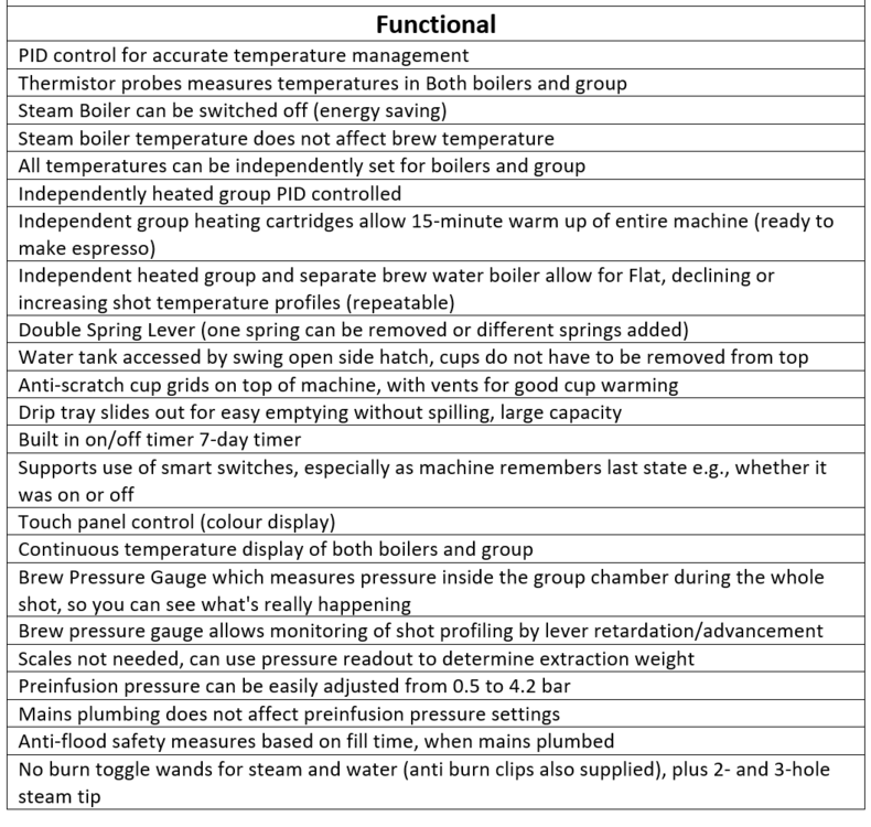 Twee boilers apart te verwarmen,groeptemp. apart te regelen,pre infusie tot 4.2 bar regelbaar.