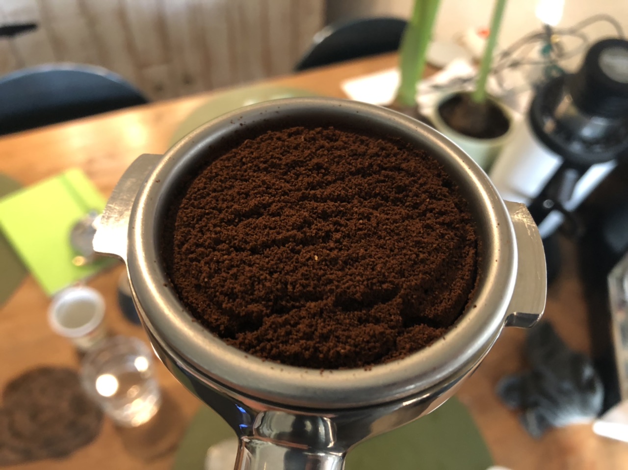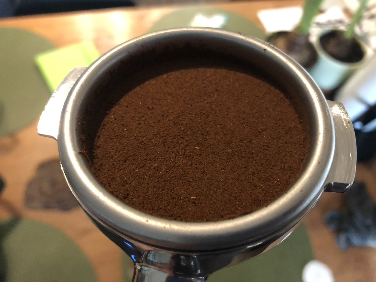 Er werd gevraagd naar een filmpje van een shot en mn puck prep. Bij deze dus een foto van het wat grovere maalsel rechtstreeks uit de maler (via dosing cup) in het filter, daarna een foto na WDT en egaliseren met zo’n draaiende koffieverdeler, daarna foto na tampen en vervolgens het filmpje.