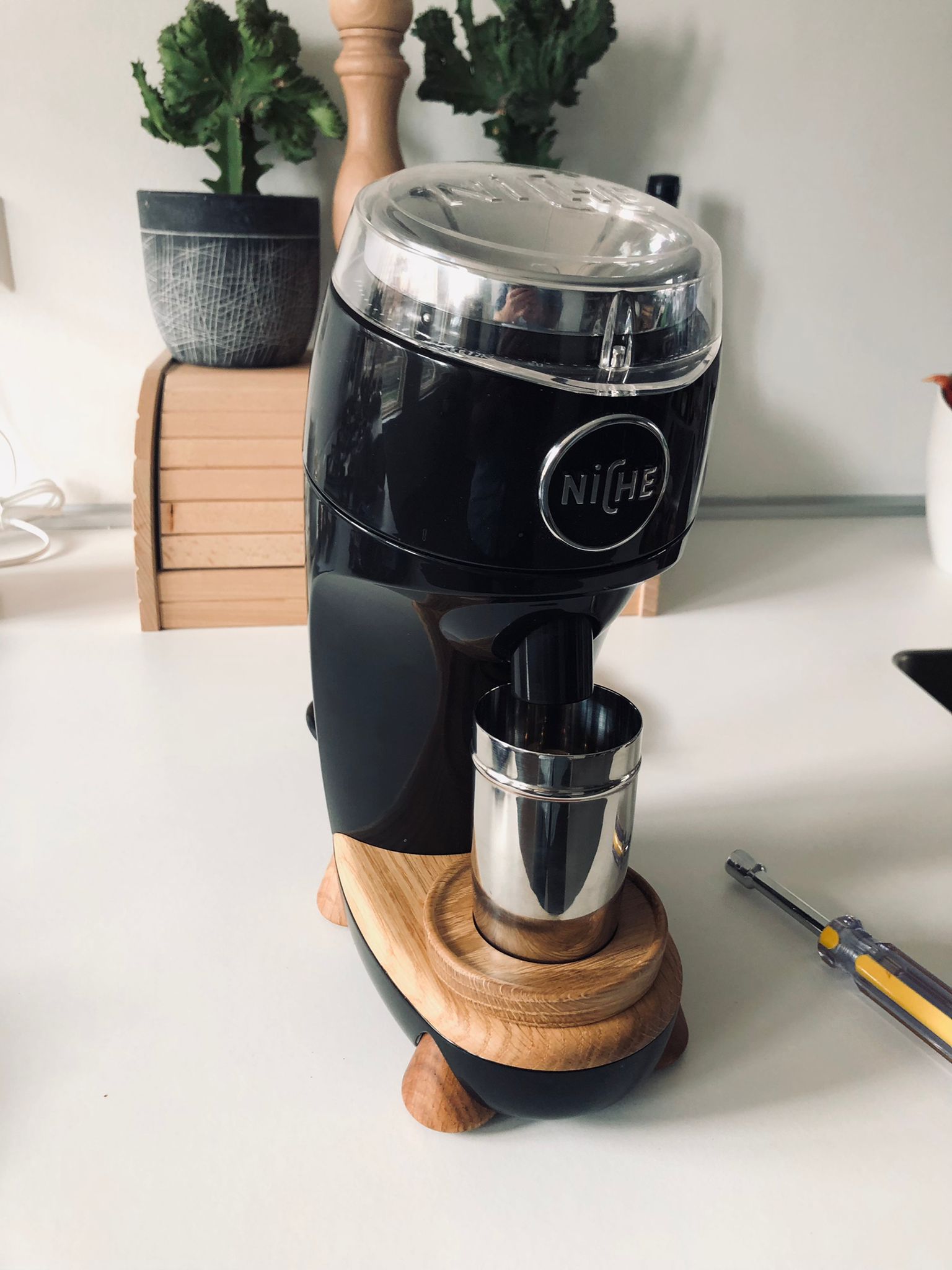 Optioneel in overleg een Decent Portafilter houder (tall) die erop te schroeven is erbij en/of Decent Funnel (tall non-magnetic).