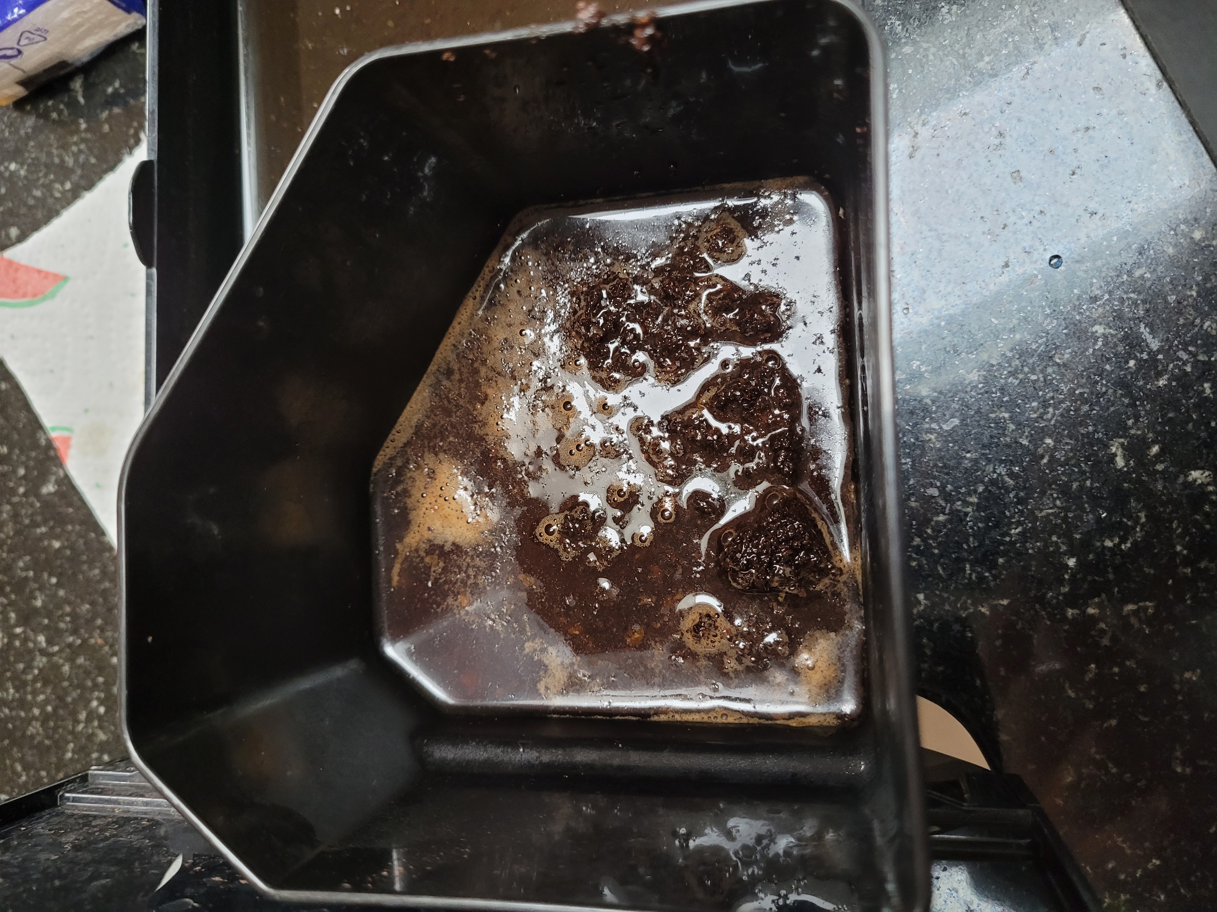 Het goede nieuws is dat het knarsende geluid weg is, maar helaas komt er nog steeds water in de residubak. Het apparaat lijkt verder goed te werken, koffie smaakt goed, maar misschien is dit de voorbode van ernstiger problemen.