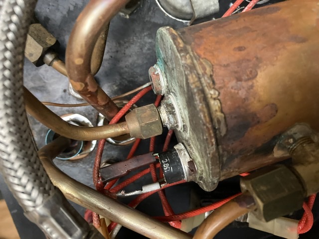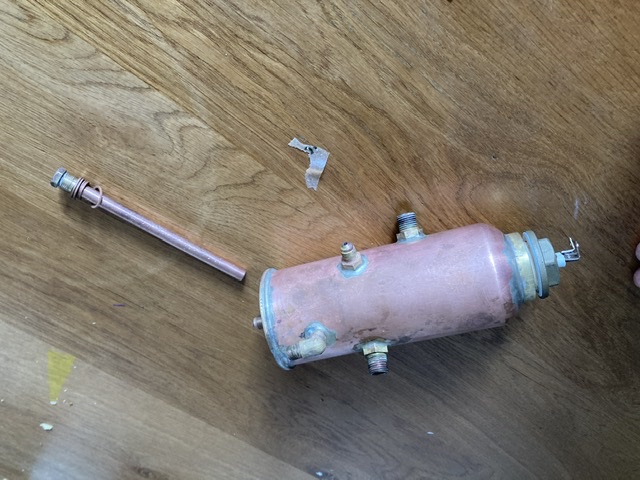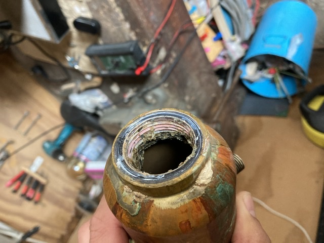 Tot nu toe heb ik de druk gemeten van de pomp, die was goed, de boiler was geheel gecorrodeerd, en zat halfvol neergeslagen kalk/zouten. Het element was doorgebrand en er zat zelfs een gat in.