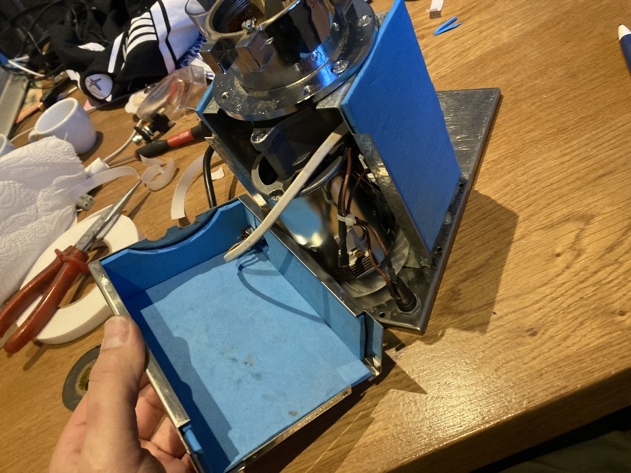 Dus ten opzichte van het origineel de enorme hopper vervangen voor wat kleins, de drukschakelaar er uit aangezien ik altijd in een bakje maal en deze vervangen door een flip switch, een balg maken, en het hele spul op een hardhouten basis zetten onder een hoek van een graad of 10, wellicht nog wat modificaties aan de uitvoer.