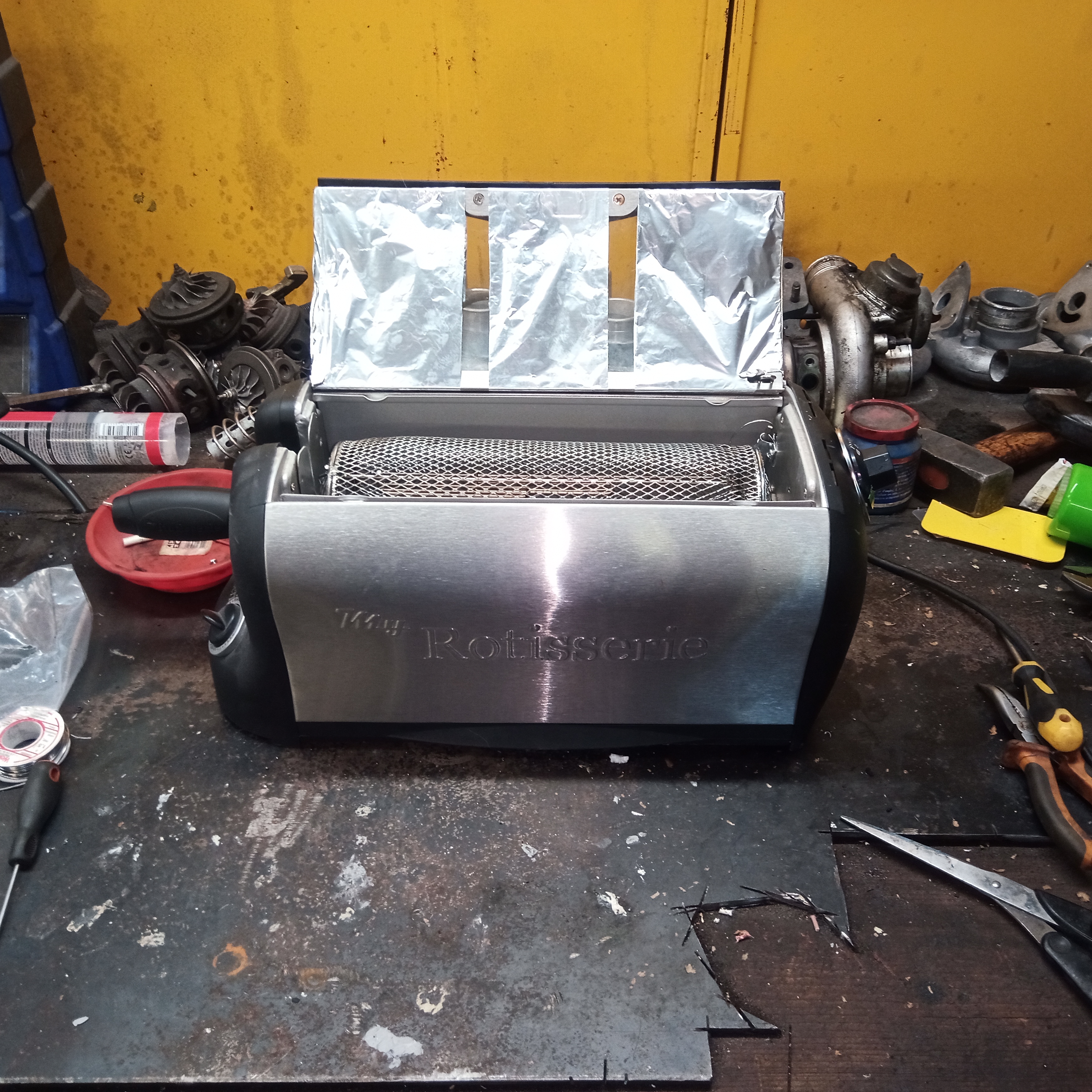 Het oventje lijkt wel wat op de Behmor brander. Die heeft reflectoren achter de gloeispiralen, gericht op het draaiende mandje. Wellicht is dat ook nog een idee om het vermogen wat te vergroten.