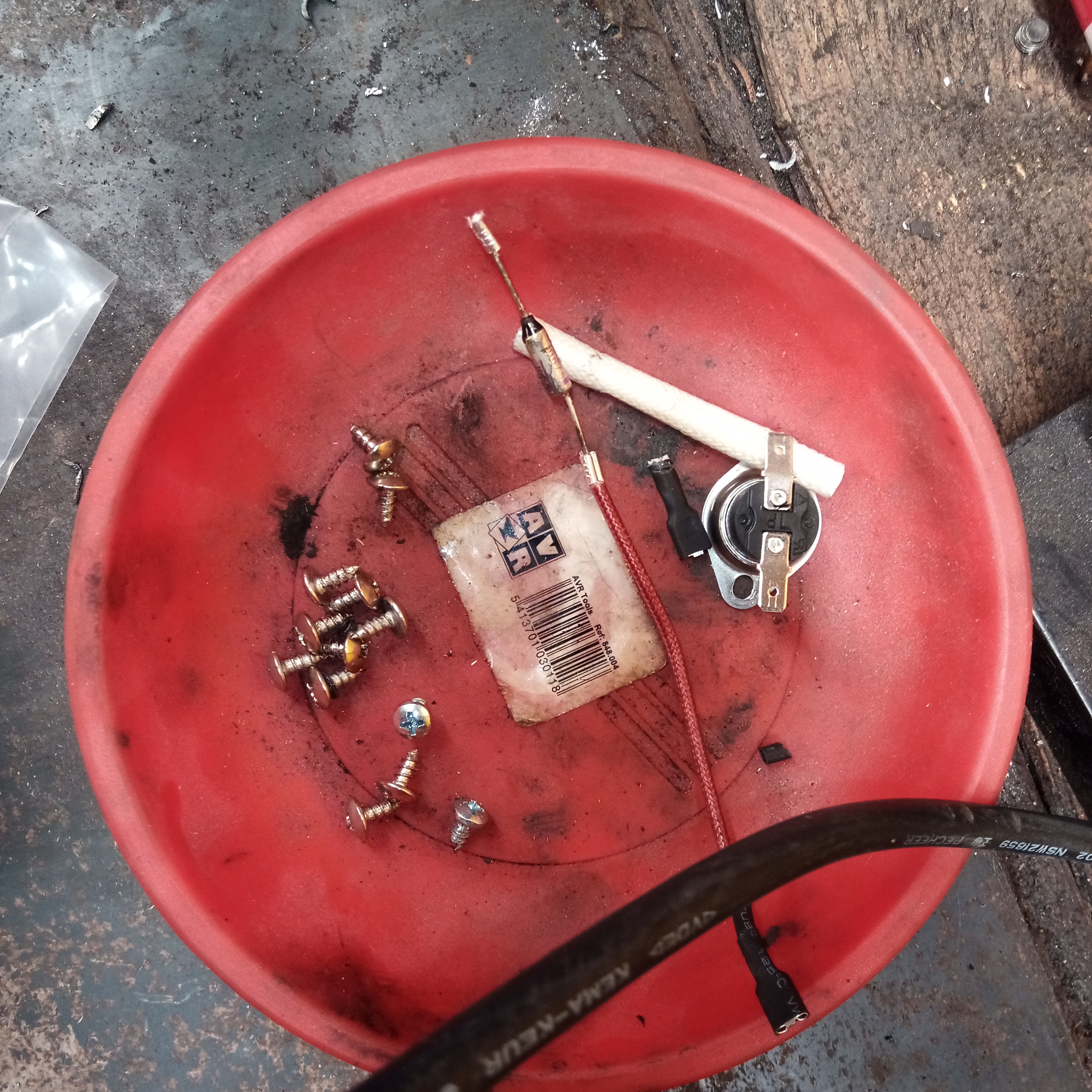 Het bakje met de twee verwijderde thermostaten er zit er dus 1 in de kabel en een op de oven wand. Nu dus vervangen door een instelbaar exemplaar.