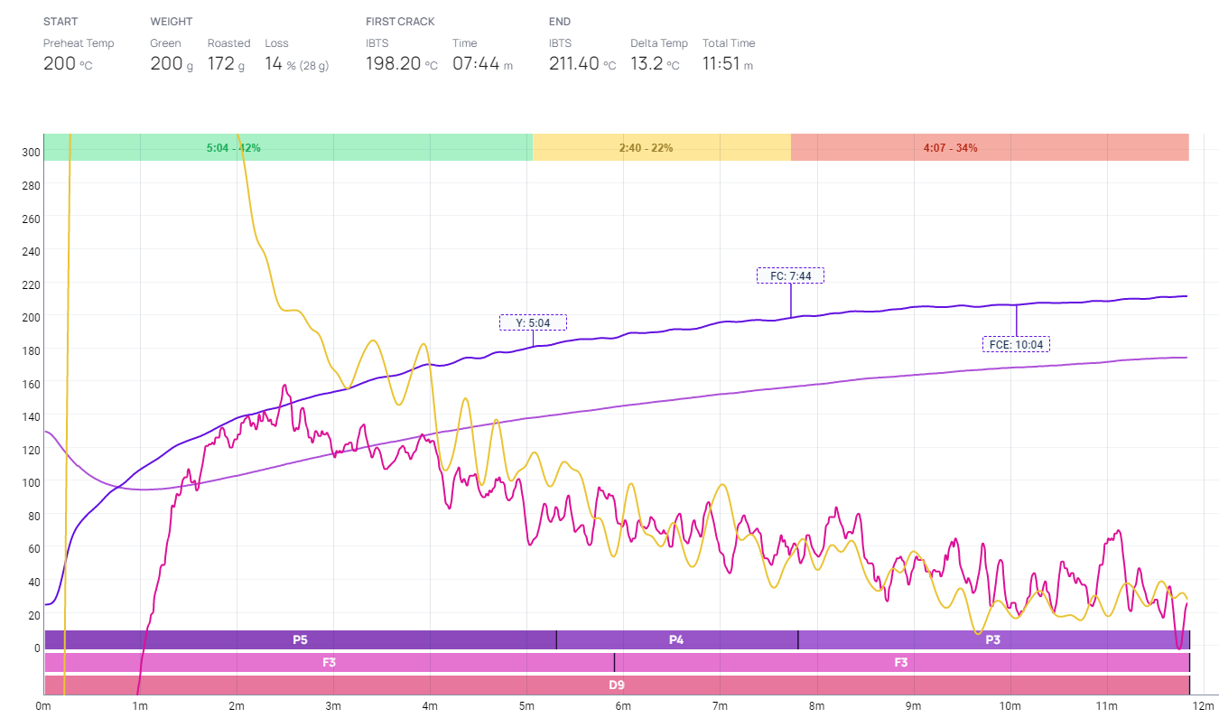 De vorige keer gingen de bonen er 2:30 na first crack uit. Nu na 1:30 en 3:30.