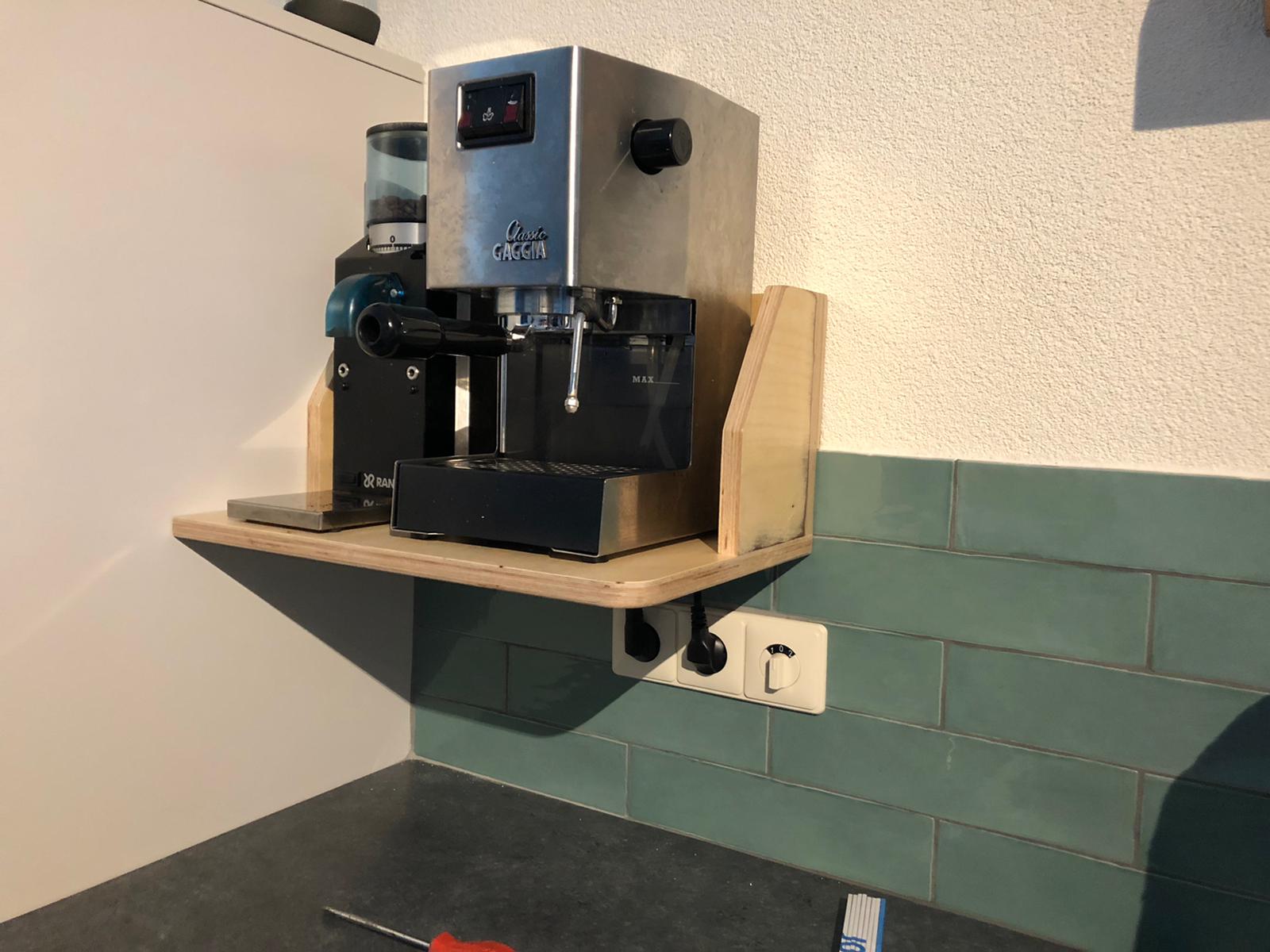 Ik gok dat ik voor de Profitec Go wel een nieuwe wat diepere plank kan maken en met een extra plug in de muur en eventueel 1 enkel schroef door de keukenkast links, het geheel stevig genoeg kan maken.