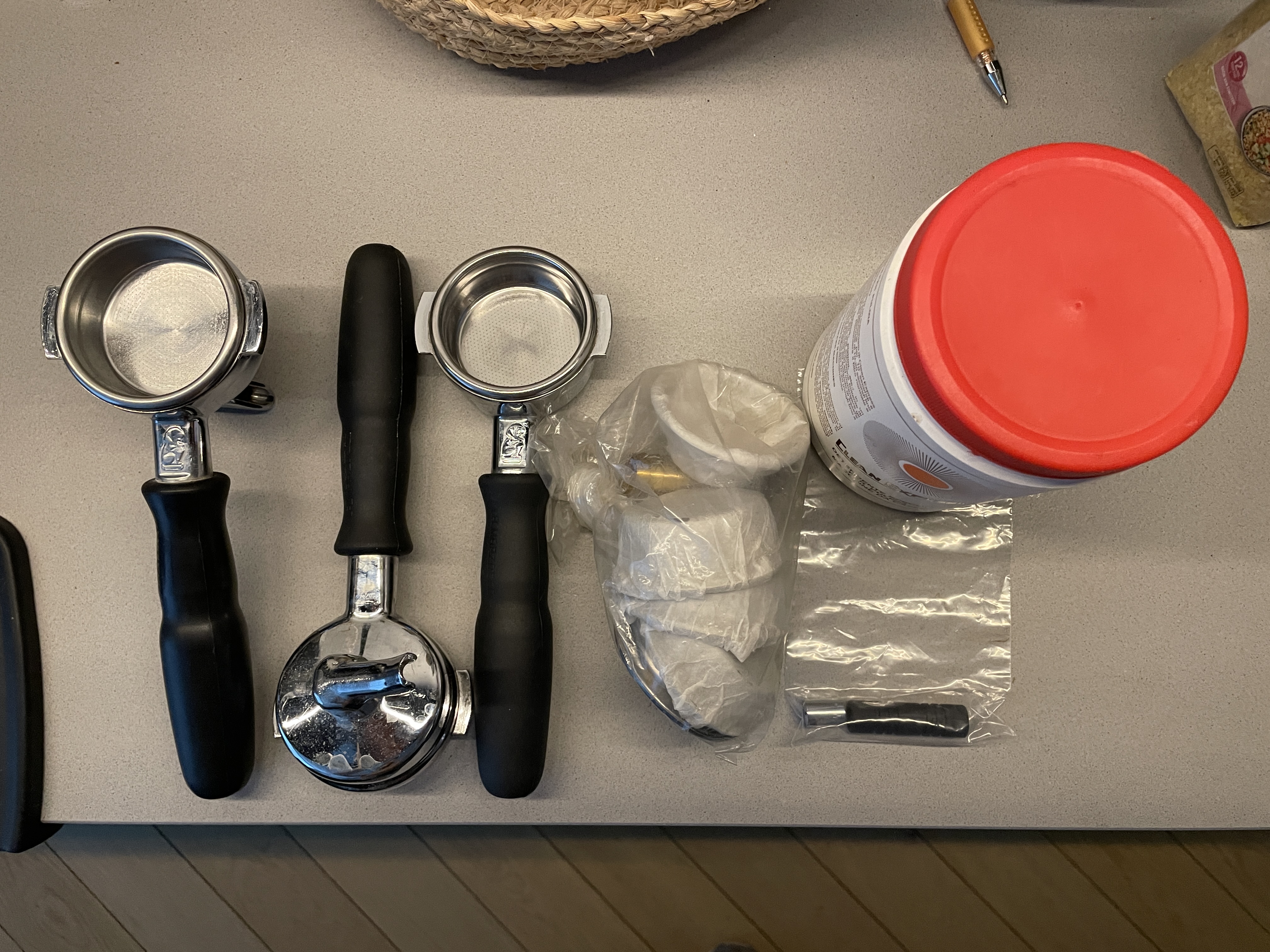 De machine komt met een drietal portafilters; een met enkele uitloop, een met dubbele uitloop en een naked.