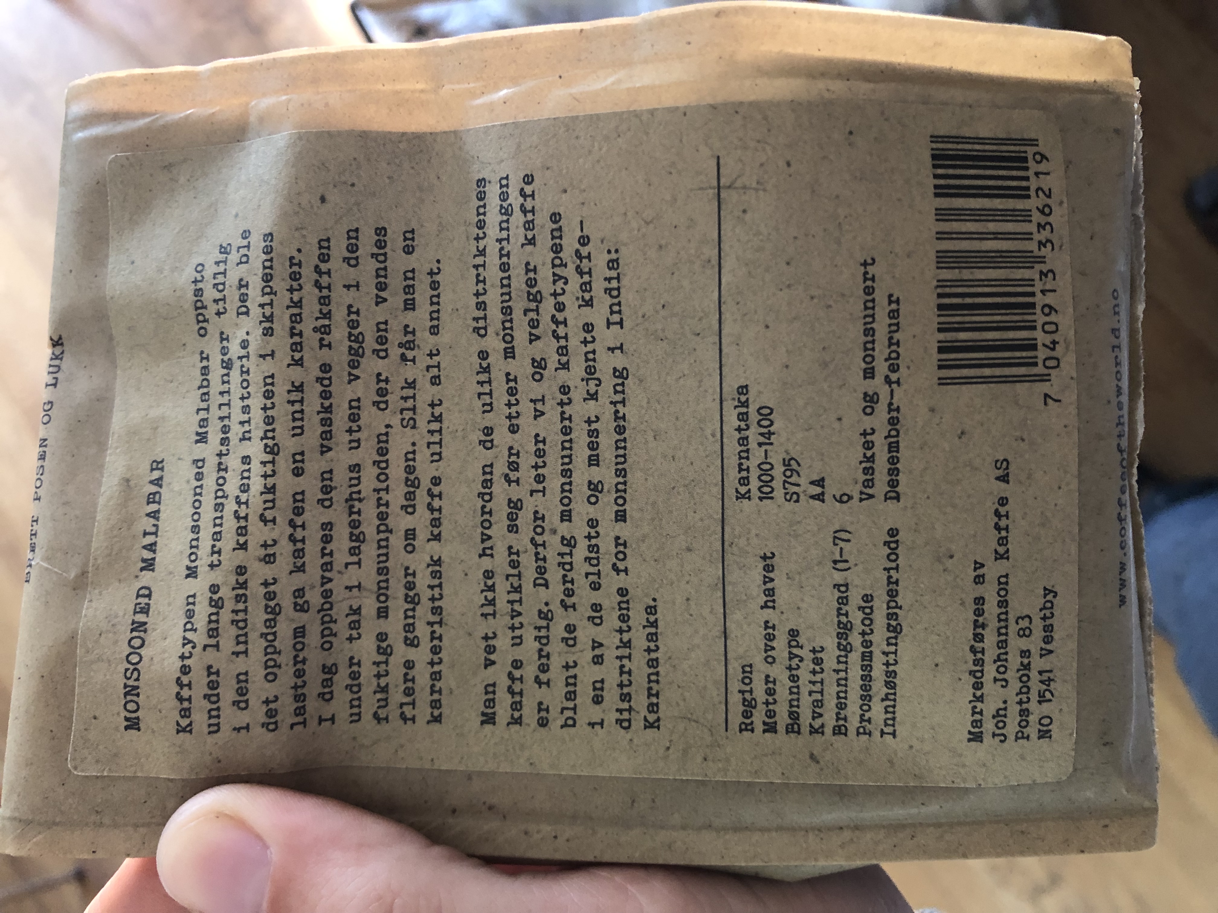 Op vakantie geweest in Noorwegen. Daar met de mokka express en de aeropress elke dag lekkere koffie gezet met bonen van Boot die ik had meegenomen. Maar toen die op waren, was geen koffie meer drinken natuurlijk geen optie. Toen in de supermarkt zag ik een zakje koffie staan waar ik wel nieuwsgierig naar was. Monsooned Malabar met nog best wat informatie op het zakje. Er stond een ten minste houdbaar datum op van mei 2024, dus als ze ook één jaar aanhouden na brand datum dus ook redelijk vers voor een supermarkt koffie. Ik dacht laat ik die eens proberen. €9 omgerekend voor 340g, ook nog best schappelijk voor een land waar alles duur is. Eenmaal het zakje open gedaan was ik niet teleurgesteld door hoe het eruit zag en rook. Bonen die niet compleet de hel in gebrand zijn ondanks de aanduiding van 6 uit 7 op de “brandings schaal”. Met de mokka express dus ook prima koffie mee gezet maar nu bij thuiskomst natuurlijk nieuwsgierig of hier ook nog acceptabele espresso mee te maken zou zijn. En ik moet zeggen dat valt me niks tegen. Krijg een normale doorloop tijd en een koffie die al helemaal met melk gewoon echt lekker is (als pure espresso was die ook best gebalanceerd. Jullie hebben er weinig aan tenzij je naar Noorwegen gaat maar ik was dus aangenaam verrast :D