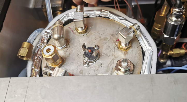 The group is heated by 2 heating cartridges that extend almost over the entire length, and these heating cartridges must be precisely regulated by the control unit (in the manner of a PID controller with power regulator).