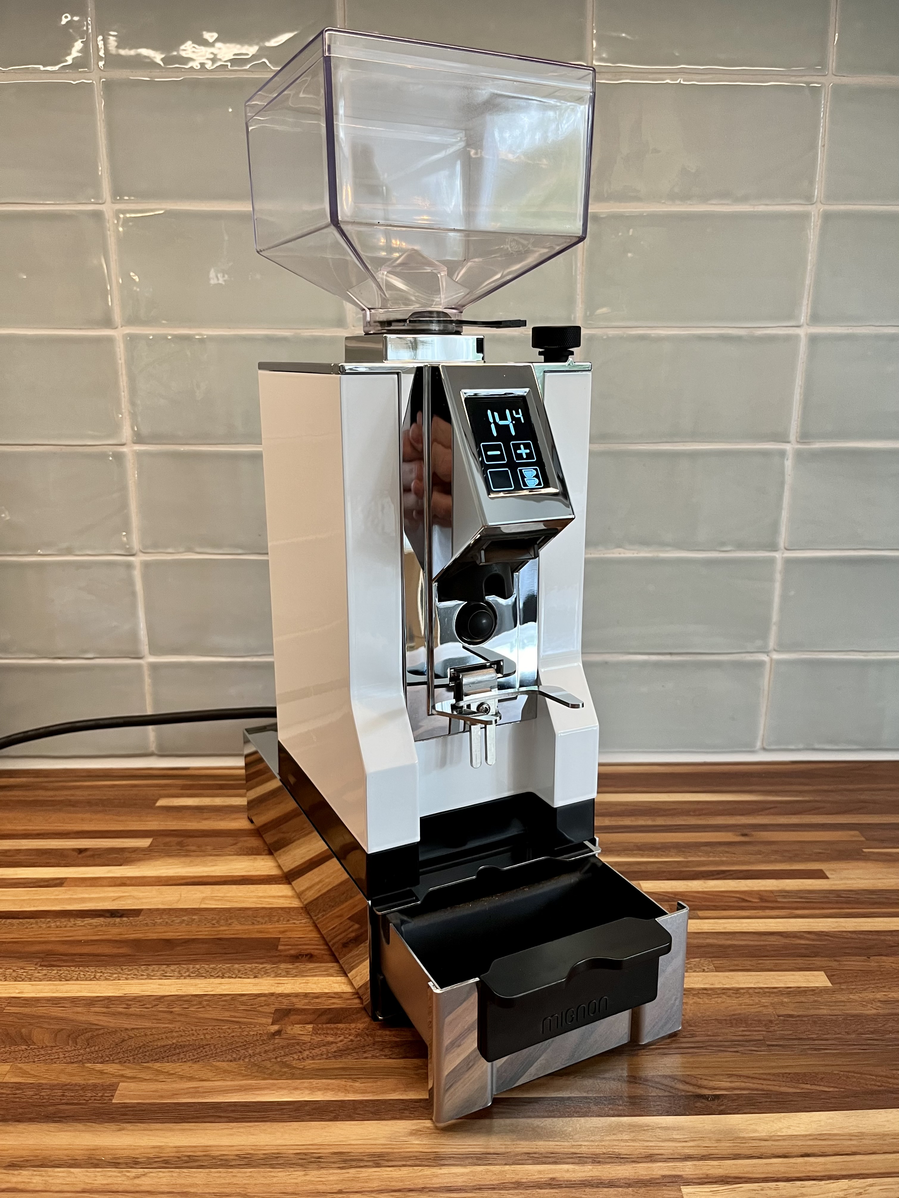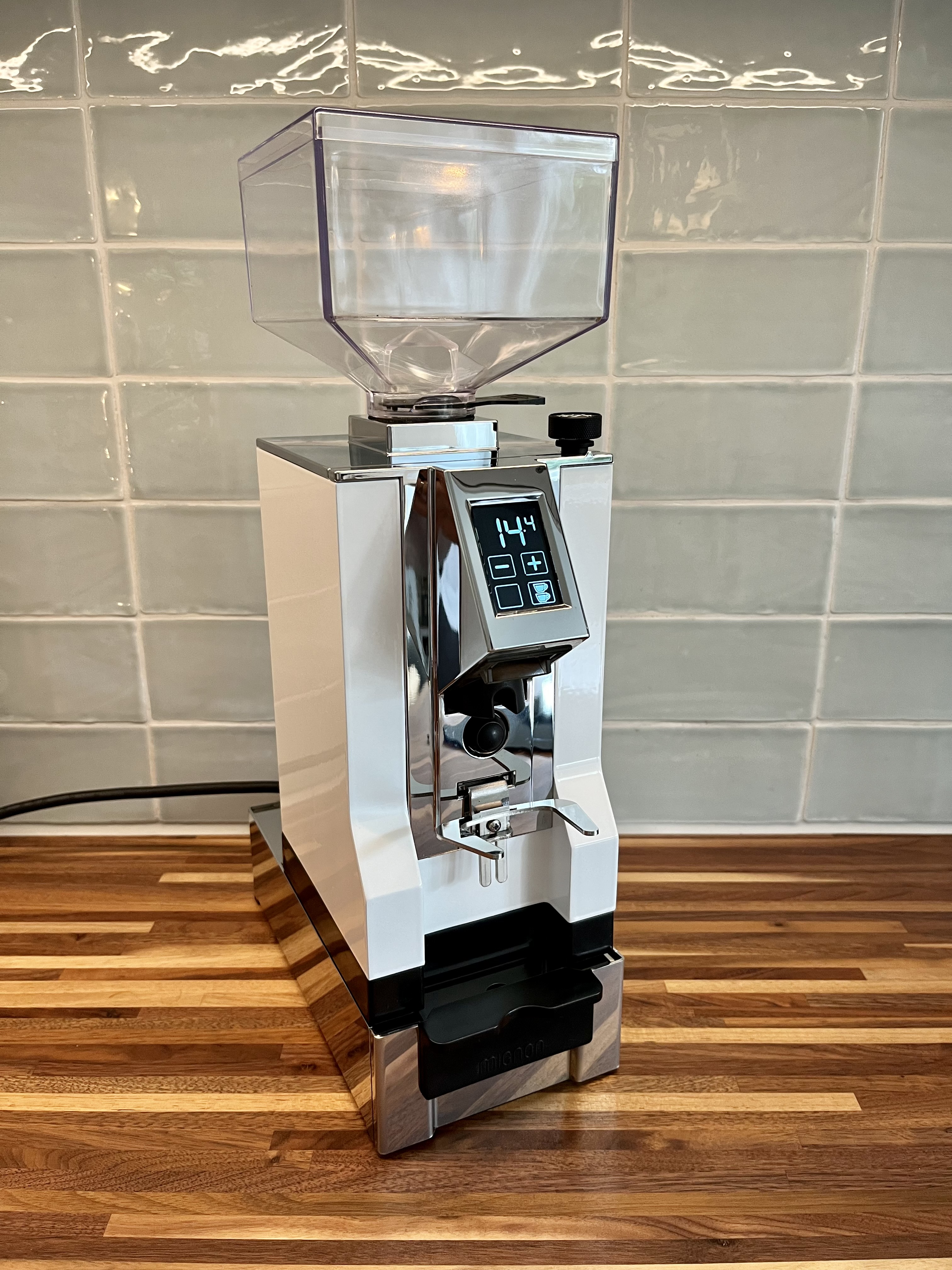 In verband met overstap naar een Niche Zero hierbij te koop aangeboden een Eureka Mignon Specialita in wit/chrome uit november 2021. Plus een Eureka uitkloplade.