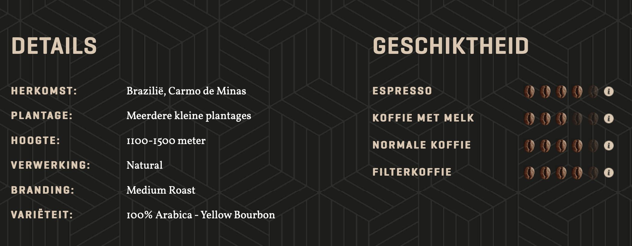 ''Het is een mild zoete en volle koffie met een heerlijke bite. Proef deze toegankelijke Braziliaanse koffie en ontdek lichte tonen van cacao, hazelnoot en walnoot met een hintje tabak in de nasmaak. (..) Net als bij gewassen koffies, wordt de boon door een wals in een waterbassin uit de bes geknepen. Het zoete suikerlaagje dat achterblijft, wordt bij Honey Coffee mee opgedroogd en later verwijderd. Dit zorgt voor een wat vollere mondgevoel en een zoetere en minder zure smaak.''