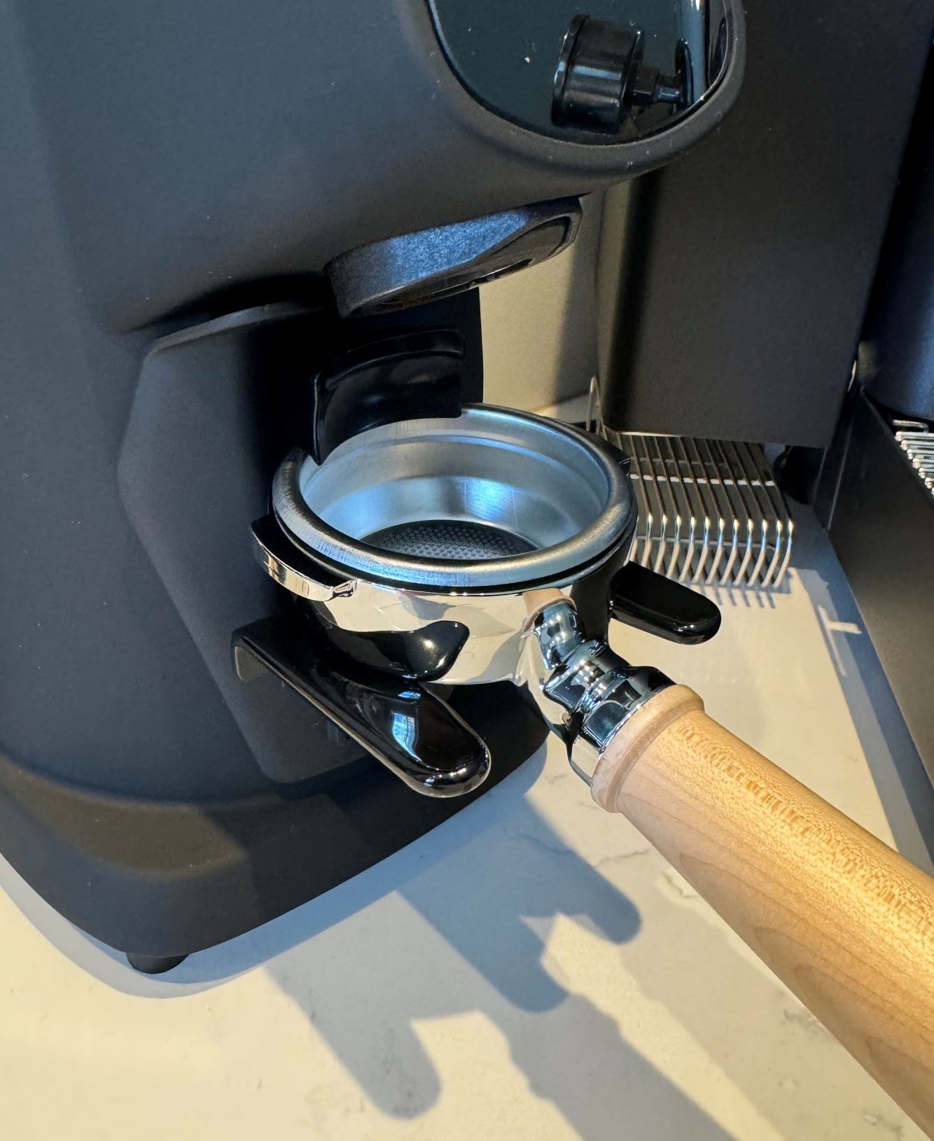 Helaas heb ik een hele grote frustratie bij de machine, dat is het design van de portafilter 'vork'. Omdat er een ingebouwde weegschaal in zit, klem je de portafilter onder een zwart 'blokje'. Dit is nog niet zo'n groot probleem, maar zodra je gaat malen en je bijvoorbeeld voor een dubbele gaat van 17 gram, er na het malen zeker 1-3 gram langs je portafilter valt. Nu dacht ik om dit probleem op te lossen een magnetische funnel te gebruiken voor op de portafilter. Echter zijn er dan 2 problemen, 1 deze kan er niet fatsoenlijk op want dan klemt hij niet meer onder het 'blokje' en 2, als ik de funnel iets naar achter zet, is deze te hoog en raakt daardoor de onderkant van mijn machine, wat er voor zorgt dat de weegschaal niet meer werkt....