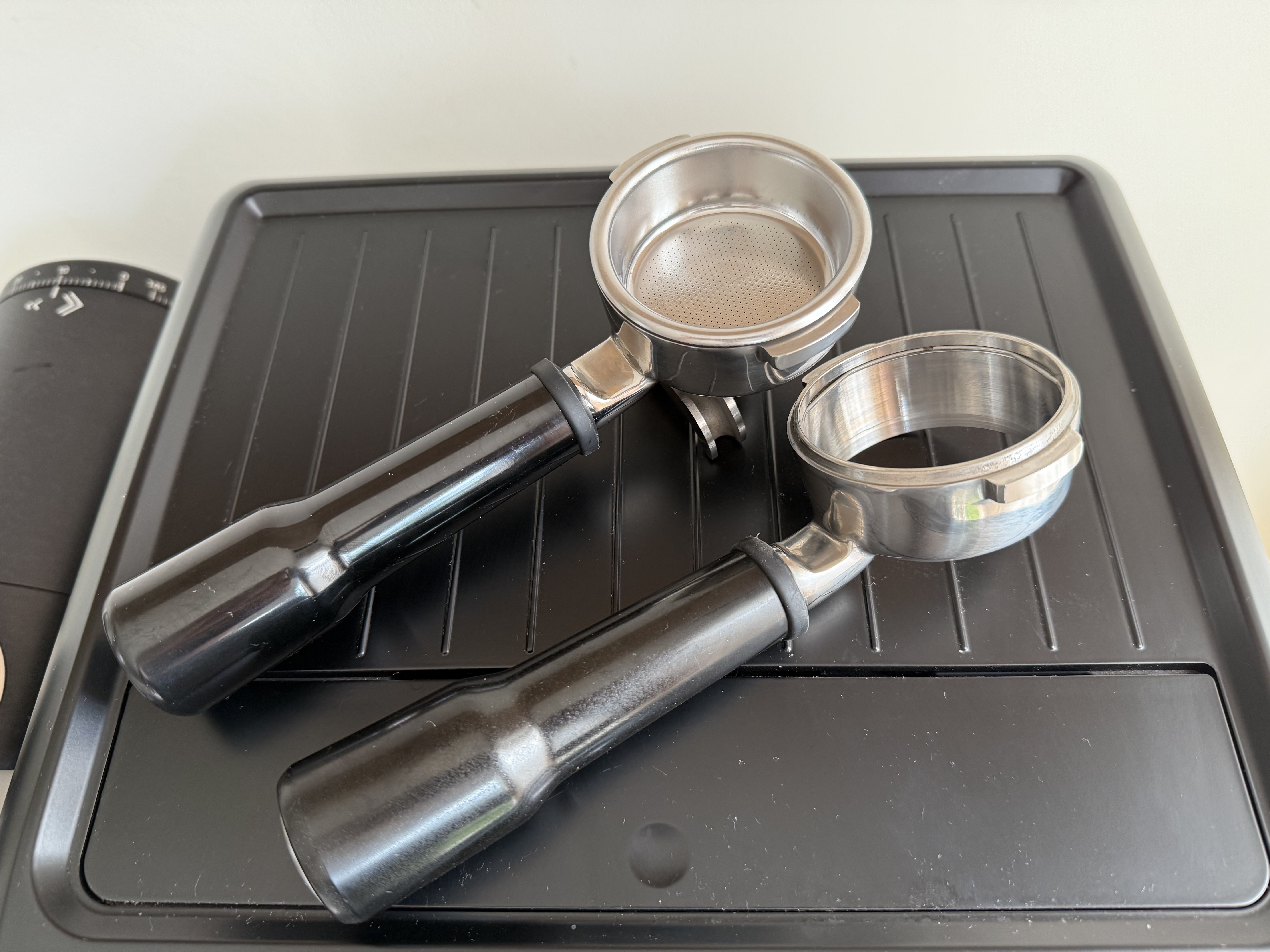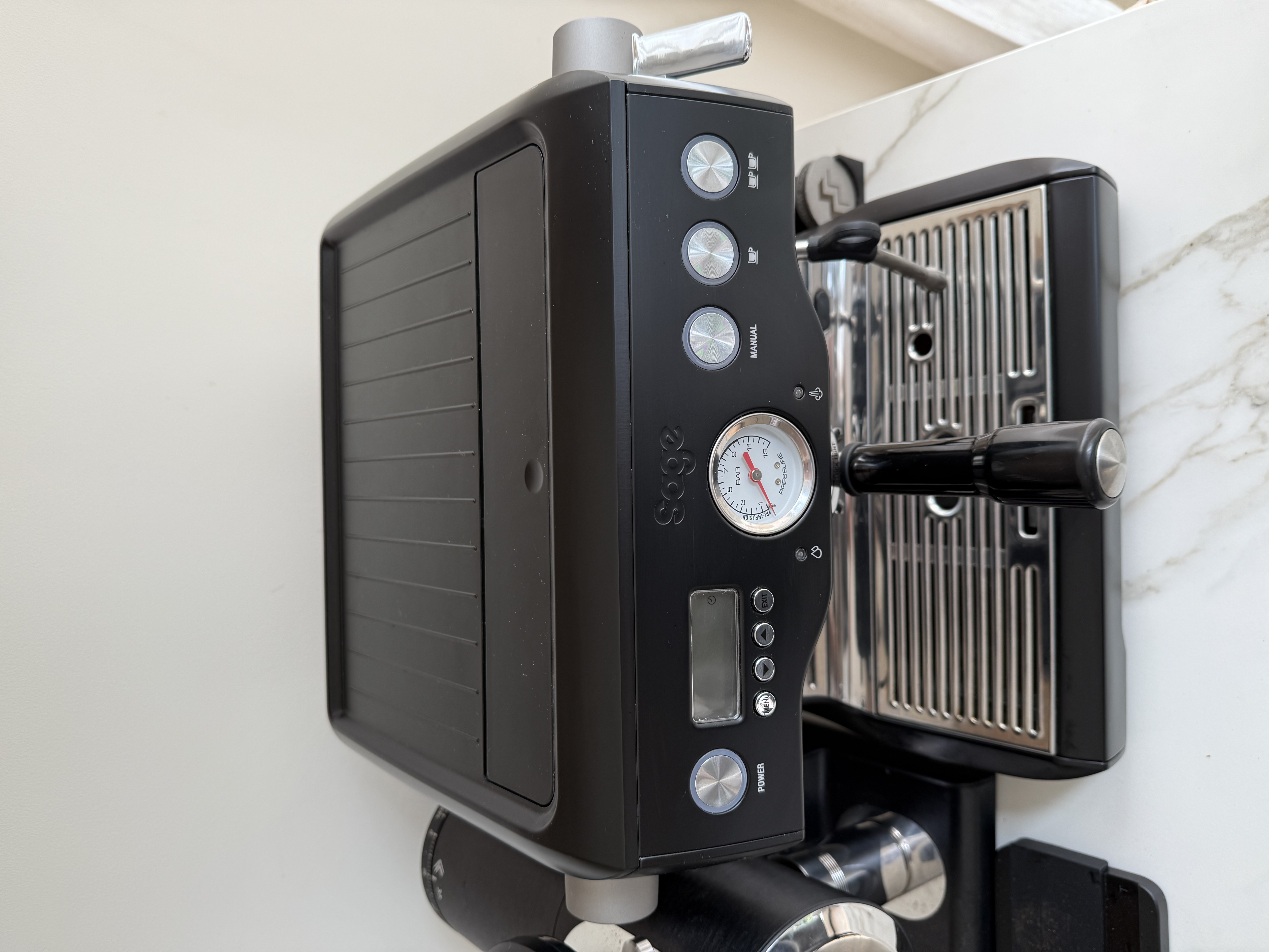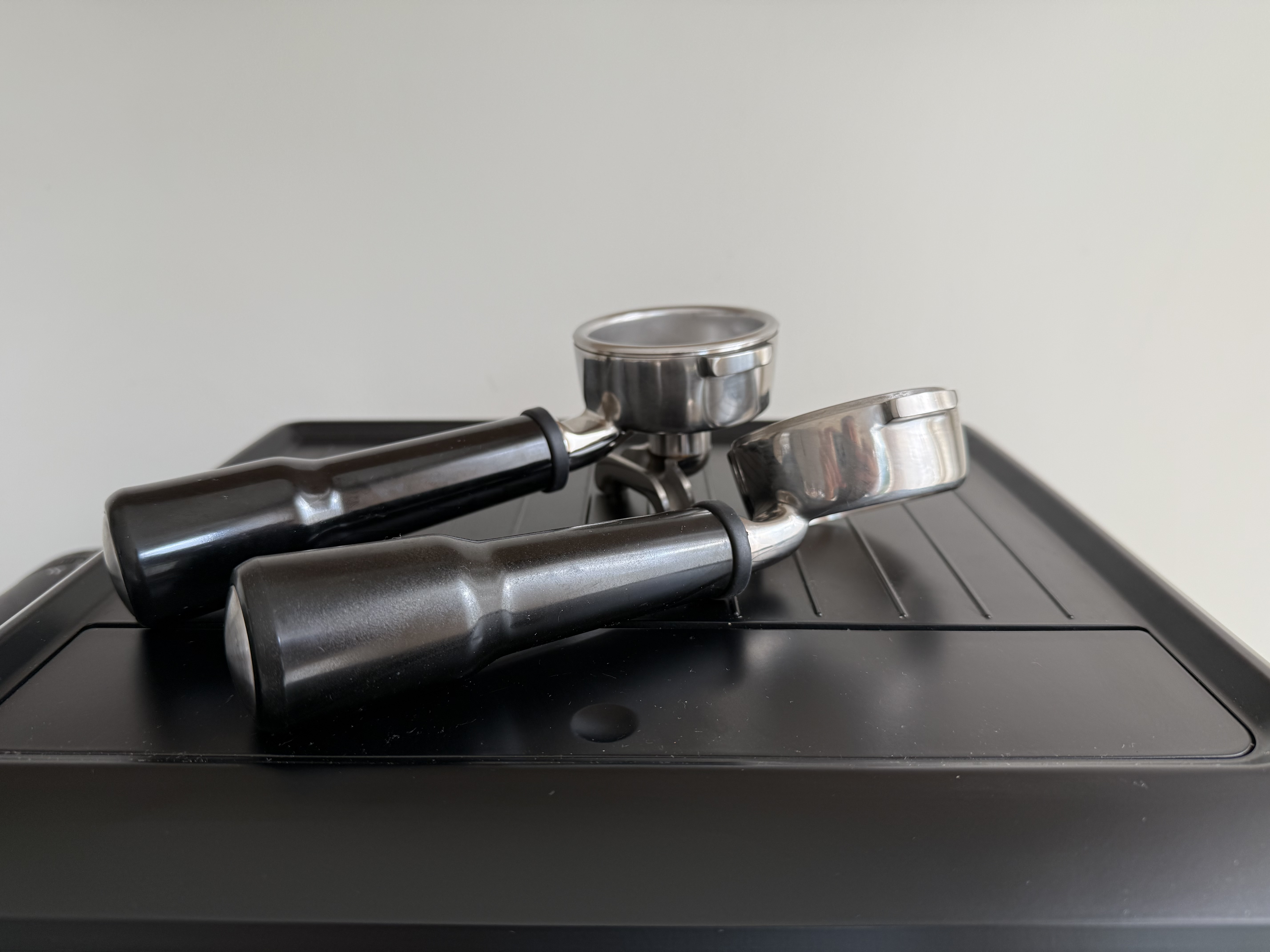 De machine komt met een melk kannetje en 2 portafilters, een originele dubbele uitloop en een bodemloze portafilter. Beide van Sage zelf.