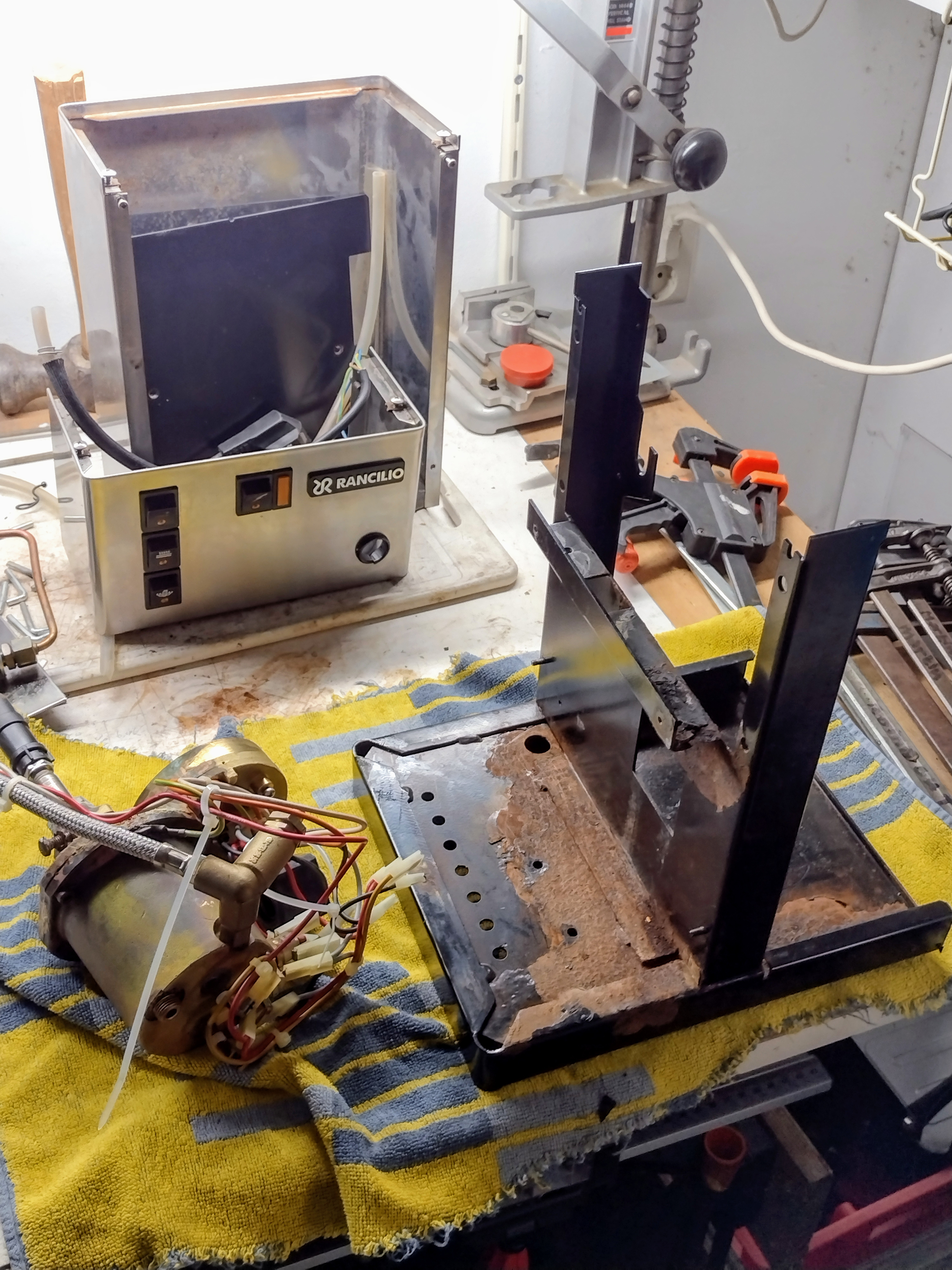 Hallo Douwetje, ik ben net nieuw op het forum en heb jouw verhaal over de restauratie van de oude Rancilio Silvia V3 gelezen. Petje af voor het verslag en de foto's die je meestuurde. Dat was een flinke klus, maar je hebt eer van je werk. Ik heb zo'n zelfde machine die na jaren in een kelder het daglicht weer heeft gezien. Het was wel even schrikken, want toen hem ging demonteren bleek ie van binnen erg geroest, verkalkt en verteerd. Bijna alle boutjes hadden zich zo vastgebeten dat ik de moed bijna opgaf. Ik heb alle onderdelen verwijderd en het chassis met de bikhamer onderhanden genomen. Hele roestplakken kwamen er vanaf. Na alle roest weggeschuurd te hebben heb ik het chassis 2x in de Hamerrite gezet. De (stalen)boutjes van de boiler kreeg ik niet los, maar naar een nachtje WD40 dacht ik dat het wel zou lukken. Inbus met kracht aan het draaien gekregen, maar na een halve slag brak ie af. Oei, en ook de rest brak af. Einde verhaal zo begreep in van Willen van Ooien van D R.Trading. Maar een nieuwe boiler is een prijzig dingetje. Ik heb na lang nadenken en veel twijfels met de handboormachine de oude boutjes er uitgeboord en nieuwe schroefdraad getapt en...dat werkte. Alleen de 2 boutjes bij de zetgroep kon ik niet doorboren. Ik heb 2 nieuwe gaatjes naast de oude geboord en daar ook draad in getapt. Een nieuwe pakking er tussen bij het proefdraaien is het potdicht.