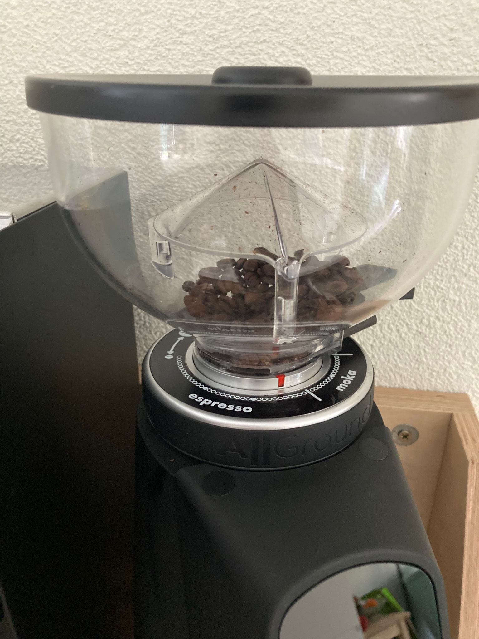 Beginnend in het midden van het espresso bereik kwam er bijna poeder uit en al snel liep de molen vol en uiteindelijk vast. Na meerdere keren met de stofzuiger op de uitgang gezet de verstopping verwijderd en steeds grover gaan malen. Uiteindelijk heel grof moeten gaan malen aan het einde van het espresso bereik, net voor het moka bereik om een goede maalgraad te krijgen.