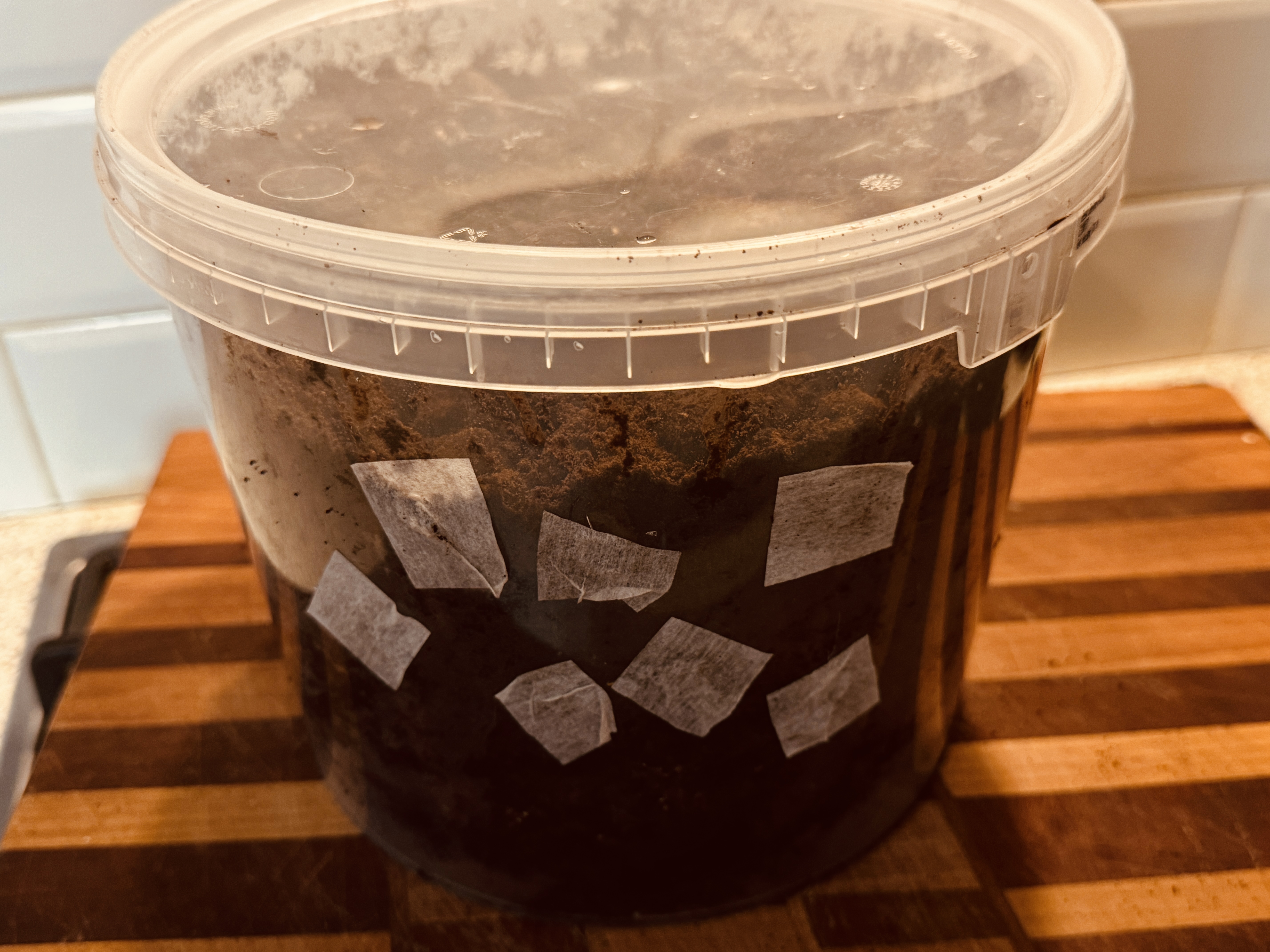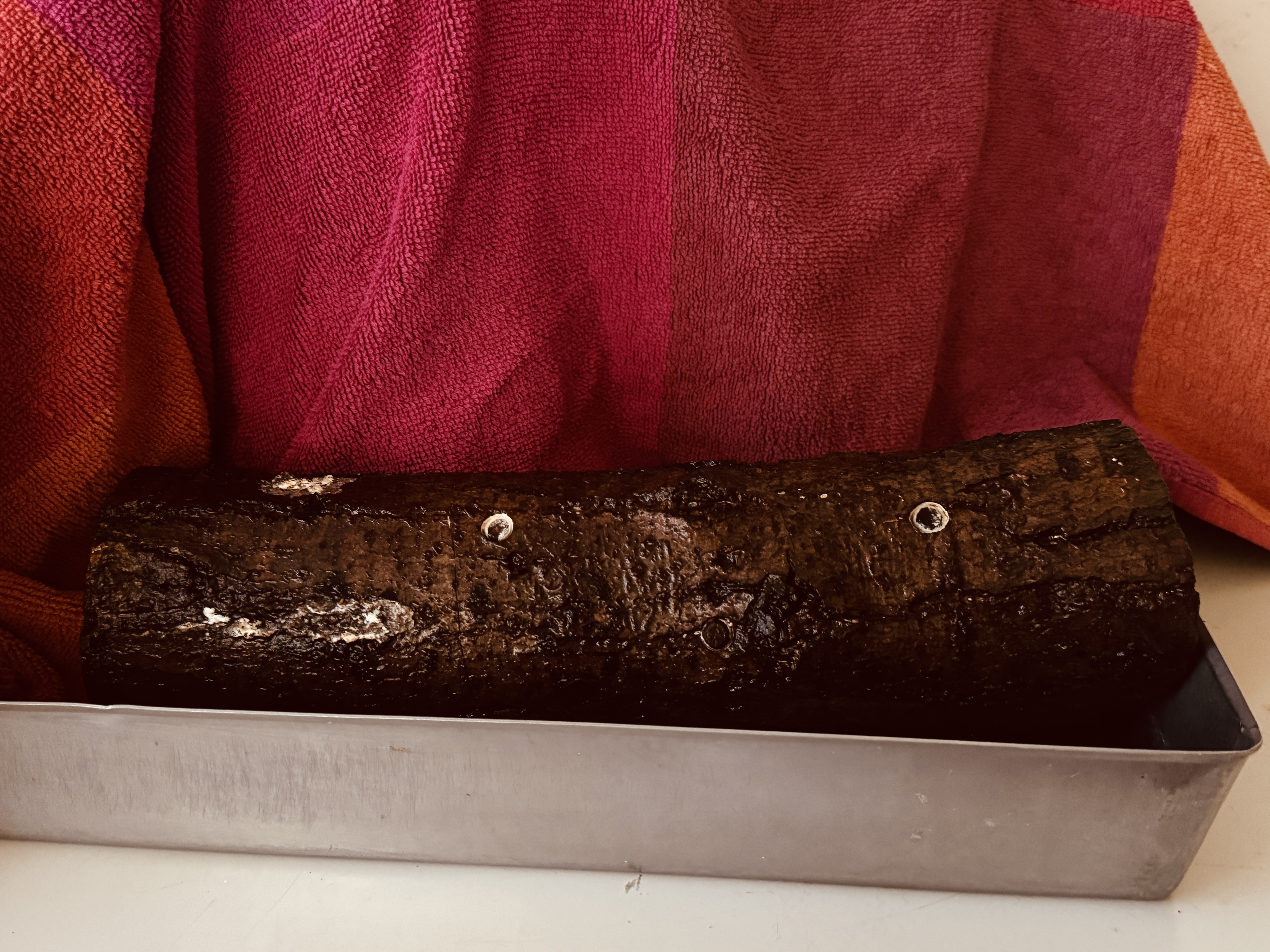 Ah, het was volgens mijn vrouw wel shiitake, maar er was geen sprake van een emmer. Volgens haar was het in een cilinder geperst soort materiaal waar sneetjes inzaten waar de schimmels uitgroeiden.