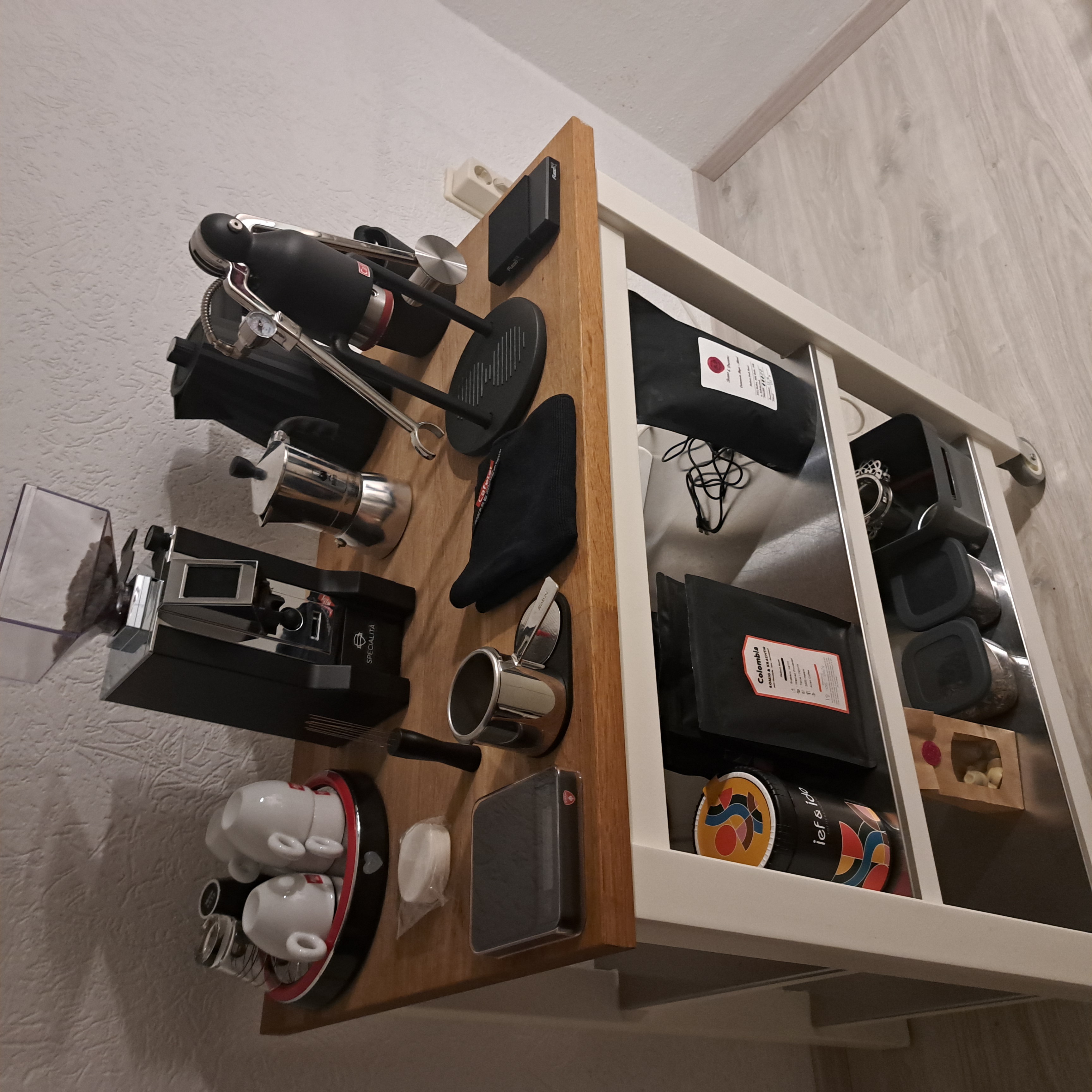 Machine voor mijn vrouw: QuickMill Aquaviva = 2820 & een QM3000. Werkruimte: Rancilio Silvia PdG V2 en La Pavoni Europiccola.