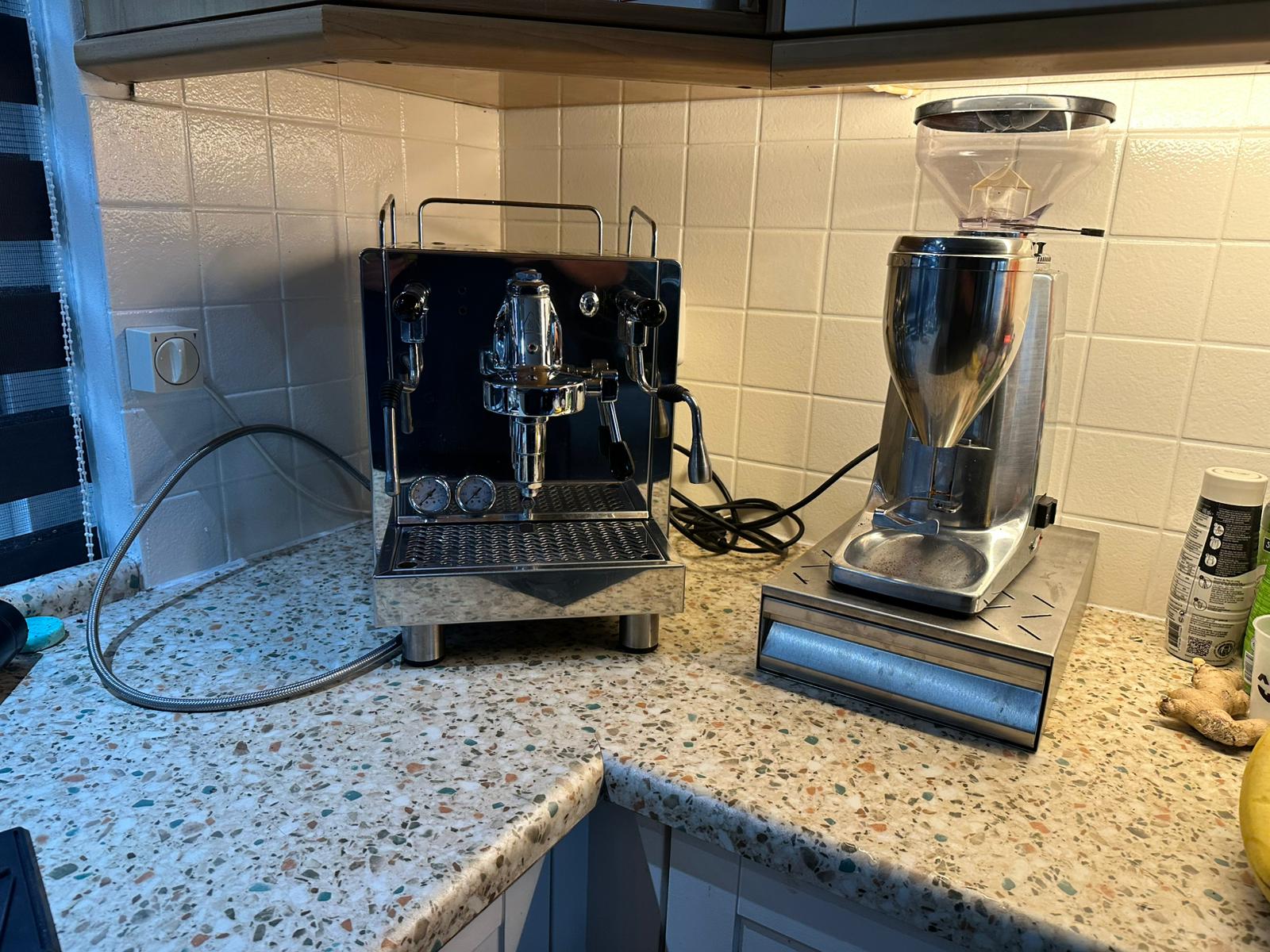 Dus nu prijkt er hier voorlopig een Bezzera Giulia met rotatiepomp en uiteraard vastwater aansluiting en een Quamar M80e.