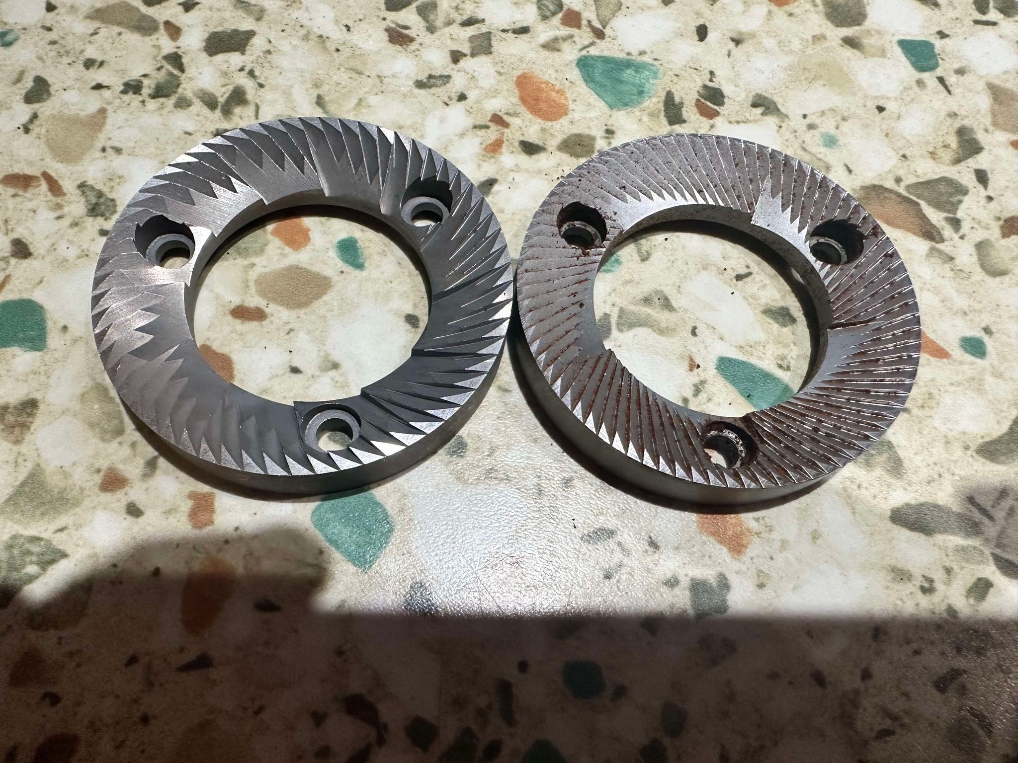 Toen vandaag de onderdelen binnen kwamen zag ik dat de schijven een heel ander profiel hadden dan dat er in de machine zaten, maar ondanks dat de nieuwe schijven nog in moeten lopen lijkt het nu al wel dat ik het maalresultaat en de shots prettiger vindt dan met de oude schijven.