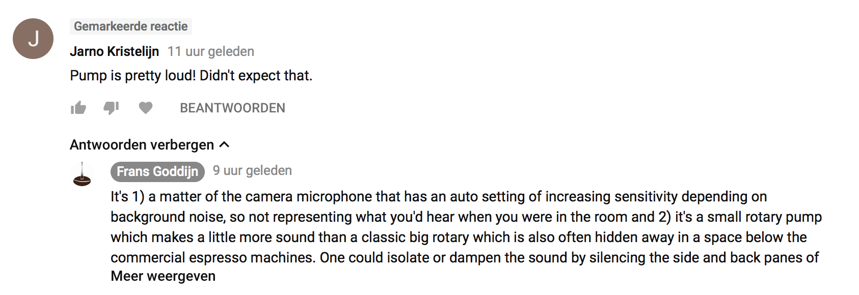 Ik vind het zelf enorm meevallen, ook doordat de pomp snel werkt (veel sneller dan een viberatiopomp) en dus maar heel even aan is, en een kort ogenblik een na-'hikje' geeft zodra de pre-infusie gereed is en je de hefboom omhoog kunt brengen.