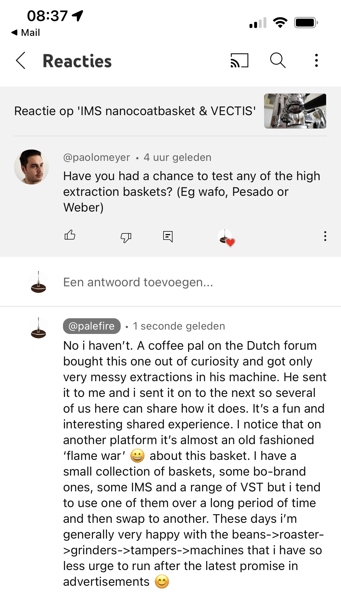 Nou, ik denk niet dat ik betere koffie zet dan jou hoor en zeker niet dat ik het beter weet!gilleko B. schreef:Koffie van de maand van het Hoofdkwartier in de bottemless met uitstekend resultaat in 14 en 16 grams resp. IMS E&B en IMS Competition mandje. Die Nanotech ging maar niet. Zou kunnen,bobbee schreef:Wel gek. Heb je het bakje met een enkele soort koffieboon geprobeerd? Ik heb ook wel zoiets gehad maar dat kwam door de boon.gilleko B. schreef:🫨
