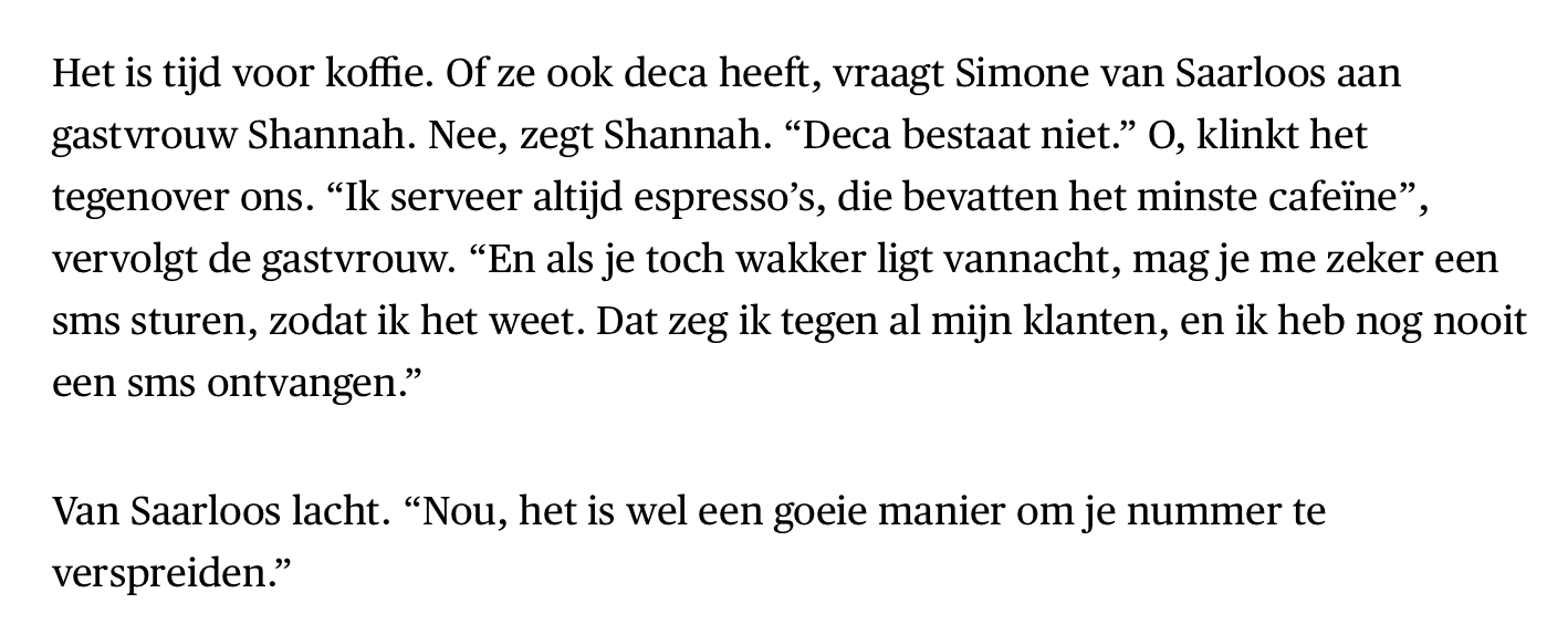 Marijn Gijsbers, Neerlands beste barista, dat is Italiaans voor koffiezetter, doet ook een duit in het zakje: 'De trend van filterkoffie, of zoals wij het noemen: slow coffee, zien we al langer, maar vooral de laatste twee jaar is het echt populair aan het worden'. Slow coffee! Hoe krijgen die types het voor elkaar om alles te bevuilen met hun vieze praat? En Marijn is nog niet klaar: 'Daarbij is het echt iets van deze tijd om weer zwarte koffie te drinken. Het is gezonder, minder vet en bevat minder dierlijke producten dan bijvoorbeeld cappuccino.' Marijn, Marijn, wat bazel je toch allemaal? Gezonder en minder vet? En als je nou- net als oma vroeger, melk in die filterkoffie - sorry, slow coffee - doet? En suiker? Dan is die weer ongezonder. Ga je baristamond spoelen.