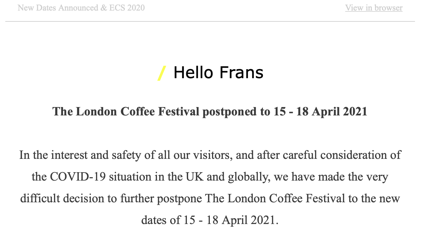 In het belang van al onze bezoekers, standhouders en medewerkers, én na een zorgvuldige evaluatie van de situatie rondom het coronavirus in Nederland en wereldwijd, hebben we de moeilijke beslissing genomen om The Amsterdam Coffee Festival verder uit te stellen naar 5 - 7 maart 2021.