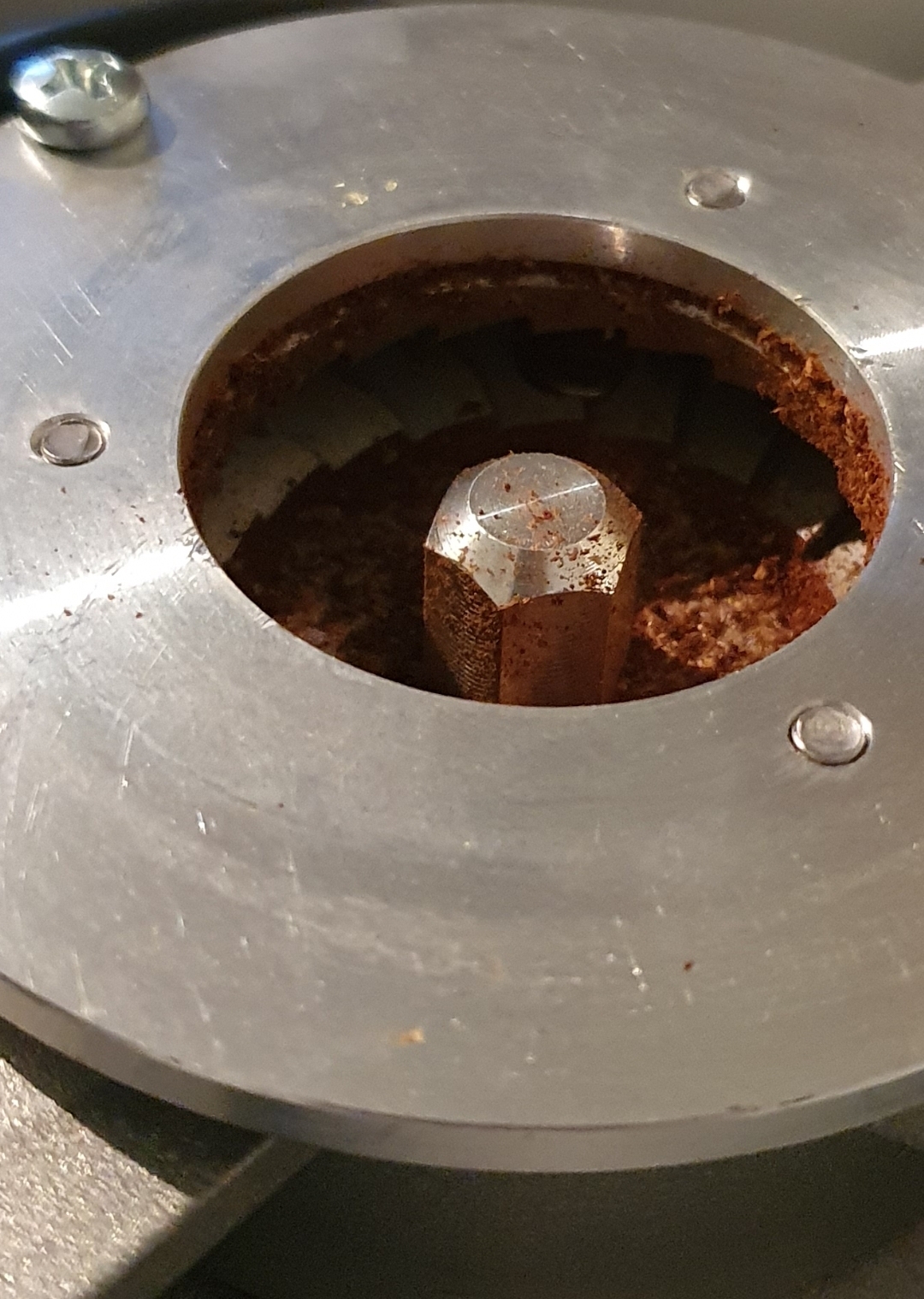 Heb er inderdaad een met te hoge schroefjes. Daardoor komt er wat koffie tussen de rubber houder van de hopper en bovenkant van de maalschijven. Het is nauwelijks een issue, maar mocht je je Mignon XL uitrusten met een blaasbalg, dan blaas je het via die weg wel door je hele machine. Met een paar laagjes zwart tape vul je die ruimte op. De laatste keer dat ik keek was het probleem daarmee opgelost.