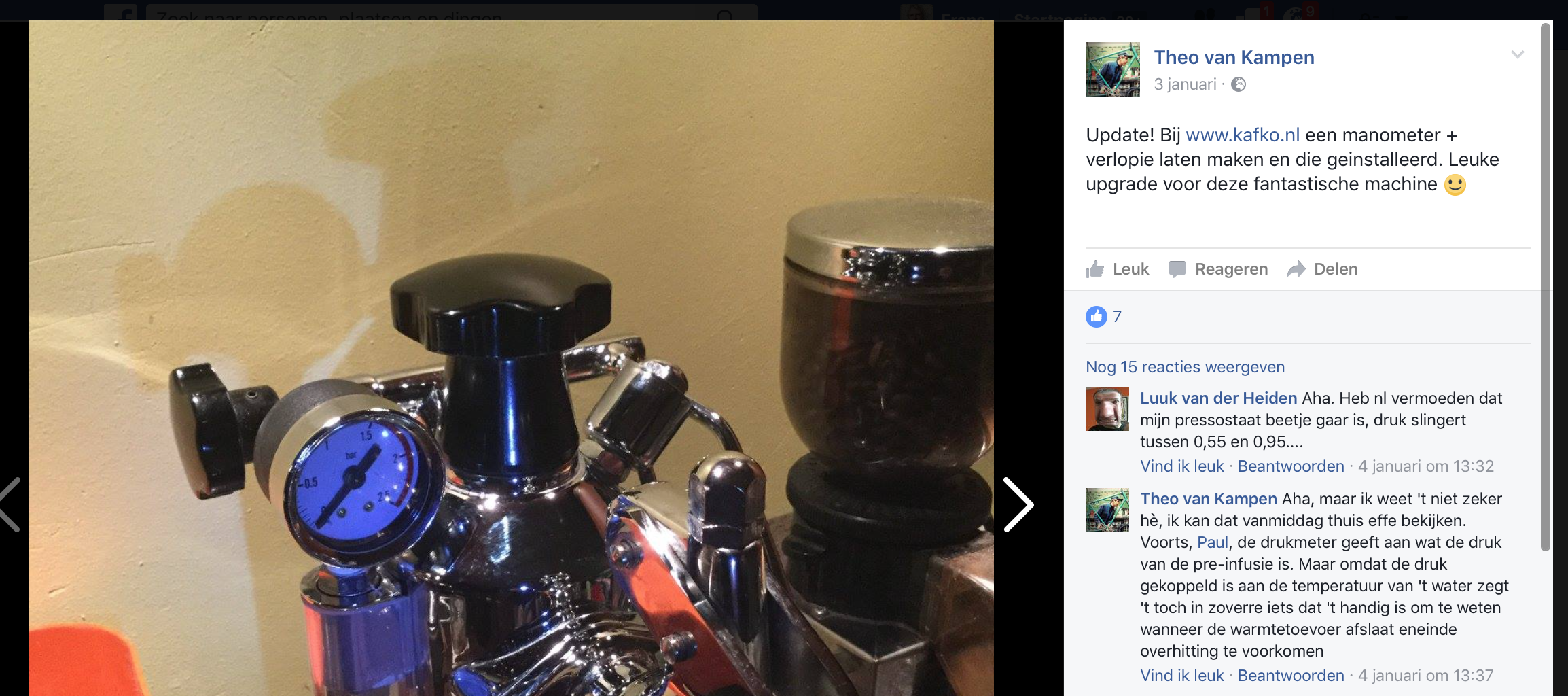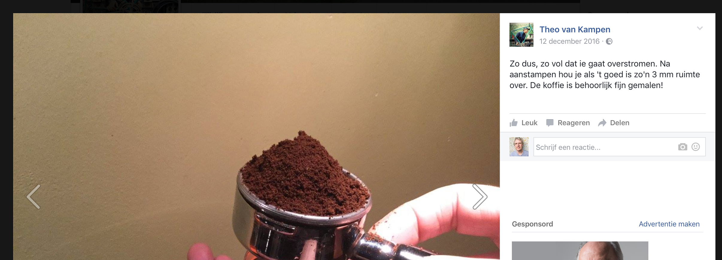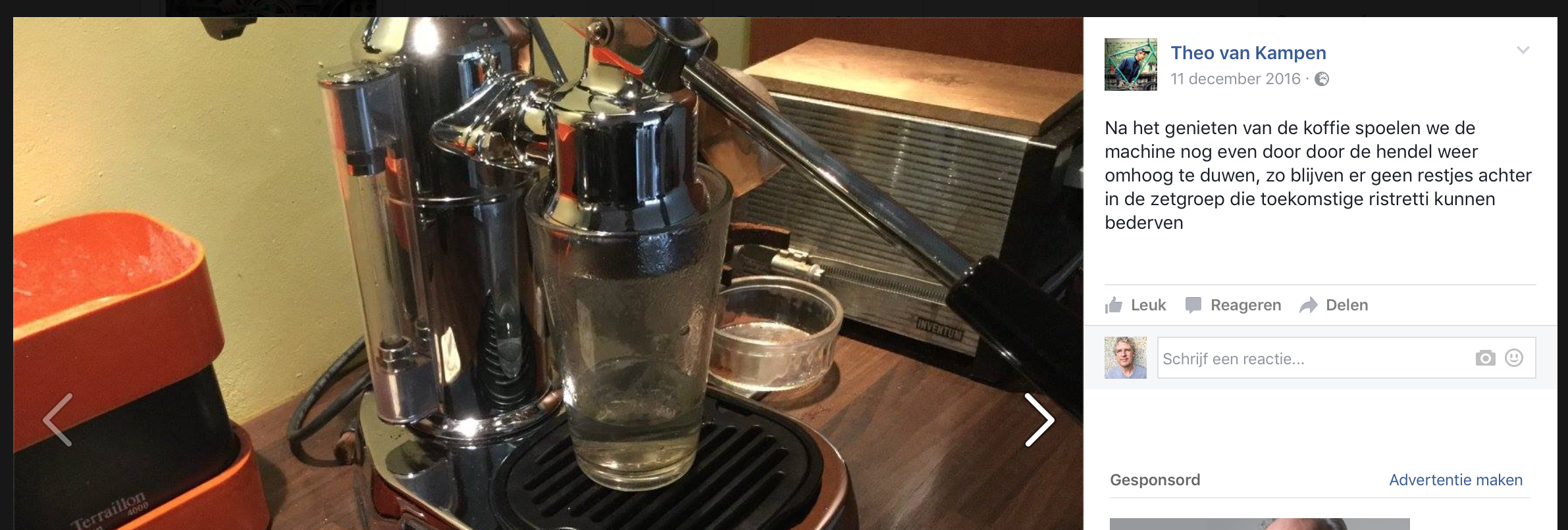 Tevens zat ik nog te denken over de opmerking dat ik twee espresso gemaakt had en niet twee ristretto. Als ik de handleiding van La Pavoni (waar bij nadere bestudering wel degelijk -zij het op de valreep en op een heel onlogische plek in de tekst- de preflush wordt geadviseerd) goed begrijp maak je één espresso door 't kleine filterbakje met koffie te vullen en de hendel 1 maal omlaag te bewegen. Als je datzelfde doet -dus de hendel 1 maal omlaag bewegen- met 't grote filterbakje in de broeikop krijg je dus 1 eenheid water voor twee maal zoveel koffie in het portafilter. Zo wordt ie relatief een stuk sterker. Toch? La Pavoni zegt dan ook in de handleiding dat je voor twee kopjes espresso: