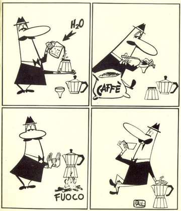 Een ervan schaft zich terloops de merknaam Bialetti aan bij een bezoek aan de curator en wij merken daar verder niets van, mokkapotjes in overvloed.