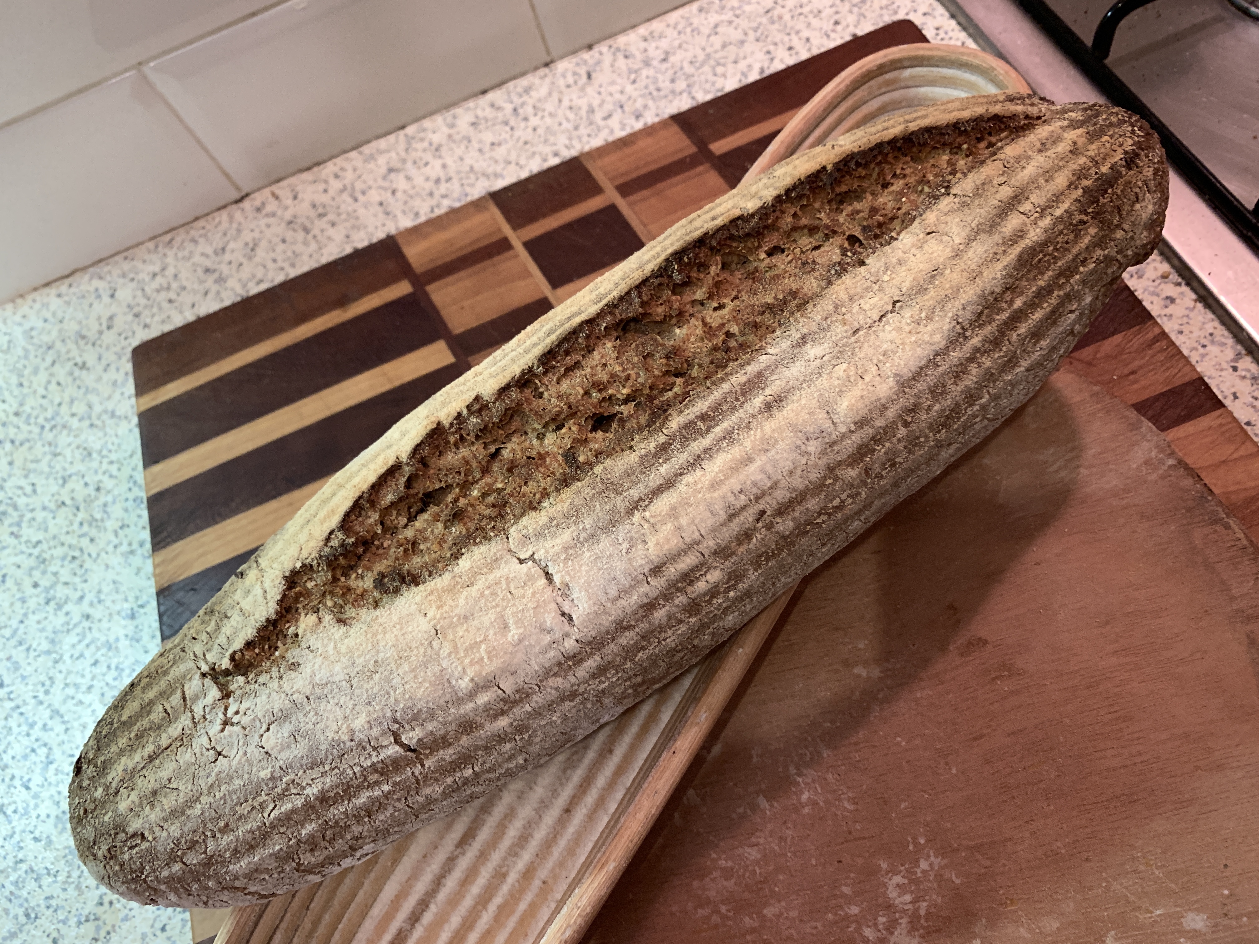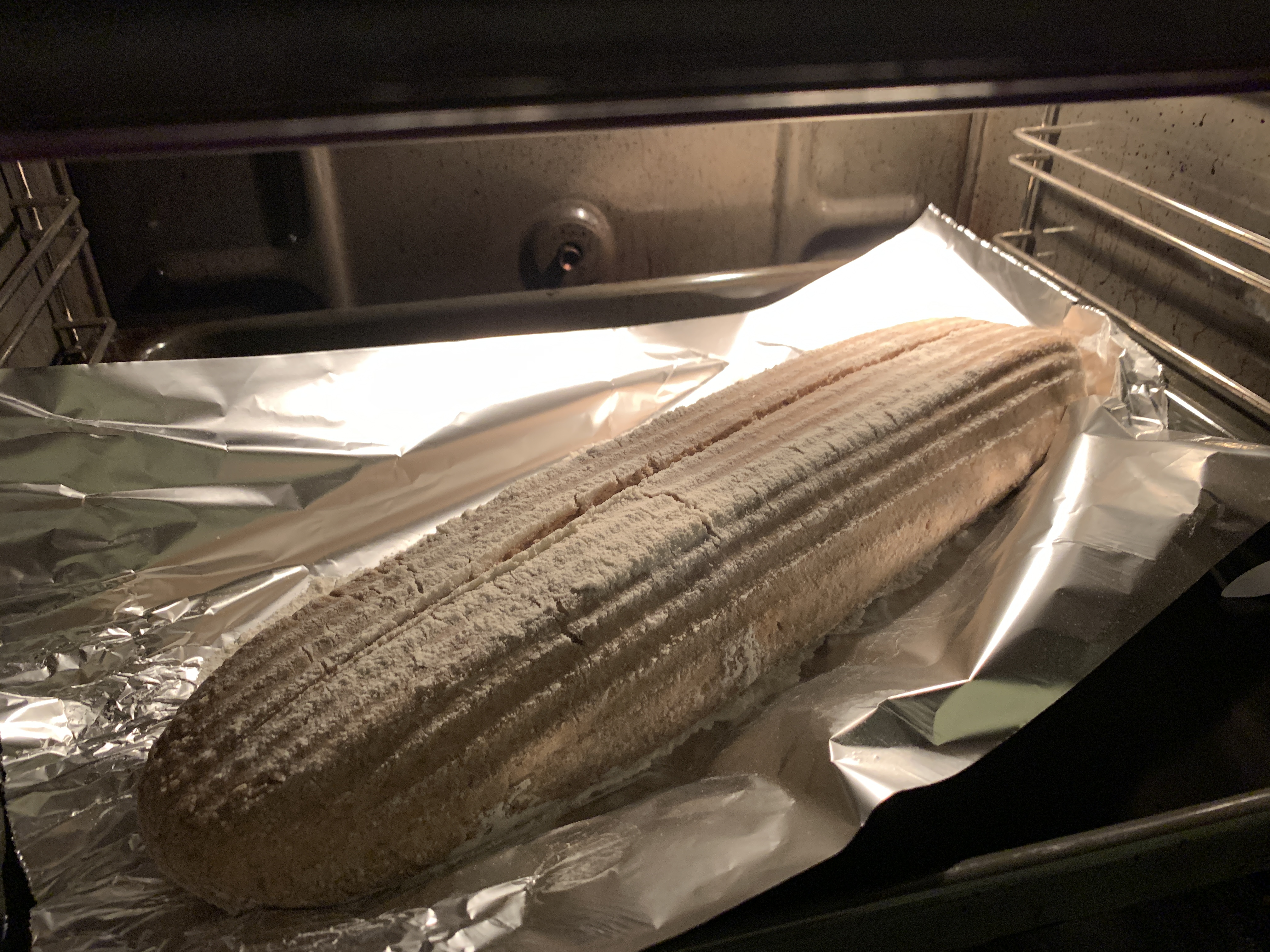 Oh ja zo zou je het kunnen zien! Ik heb een poos gelee twee mandjes weggedaan omdat ik die nooit meer gebruikte, maar deze lange dunne kwam ik toch nog tegen achterin een keukenkastje. Meteen geprobeerd, vergeten voldoende meel te strooien dus geheel vastgeplakt wat een blubber opleverde die uit de oven toch lekker was.