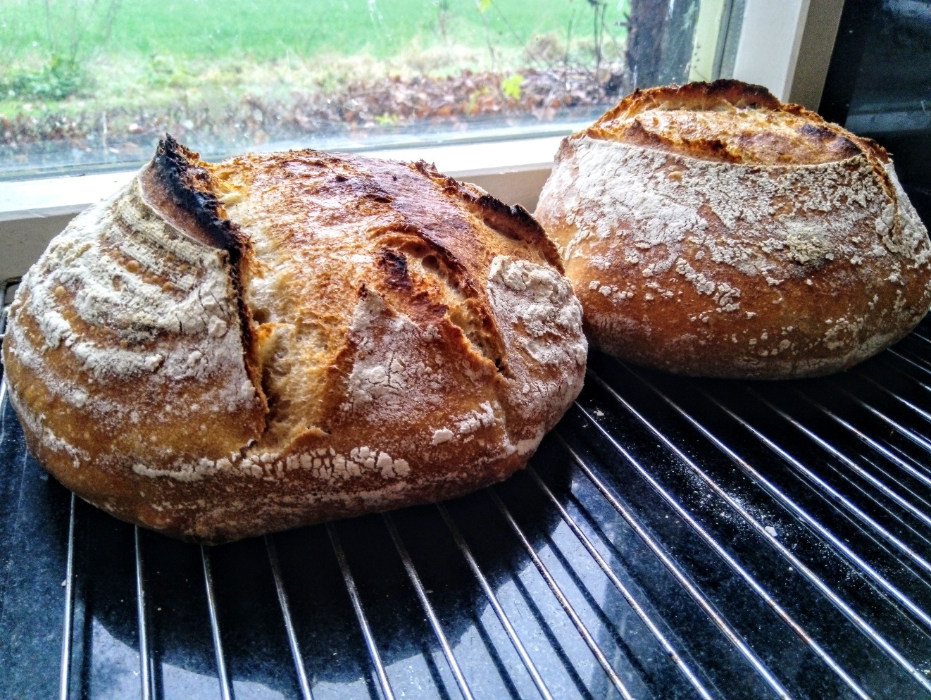 Het linker brood on afgedekt in de oven, wel bakje water en spray tegen de binnenkant van de oven, de rechter eerste 20 min afgedekt en daarna open in de oven. Zelfde deeg, zelfde fermentatie tijd etc. De nacht in de koelkast geweest, volgende ochtend de oven in.