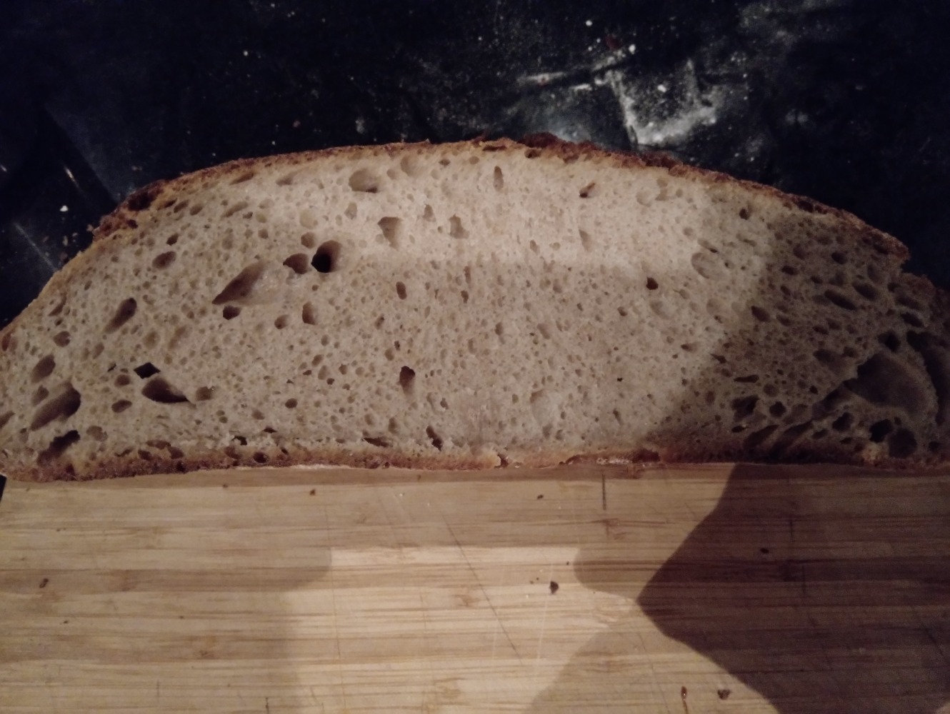 Deze vd week nog gemaakt. Met 50% versgemalen tarwe en iets van 10% versgemalen rogge, de rest goedkope bloem. Is 78% hydratatie.