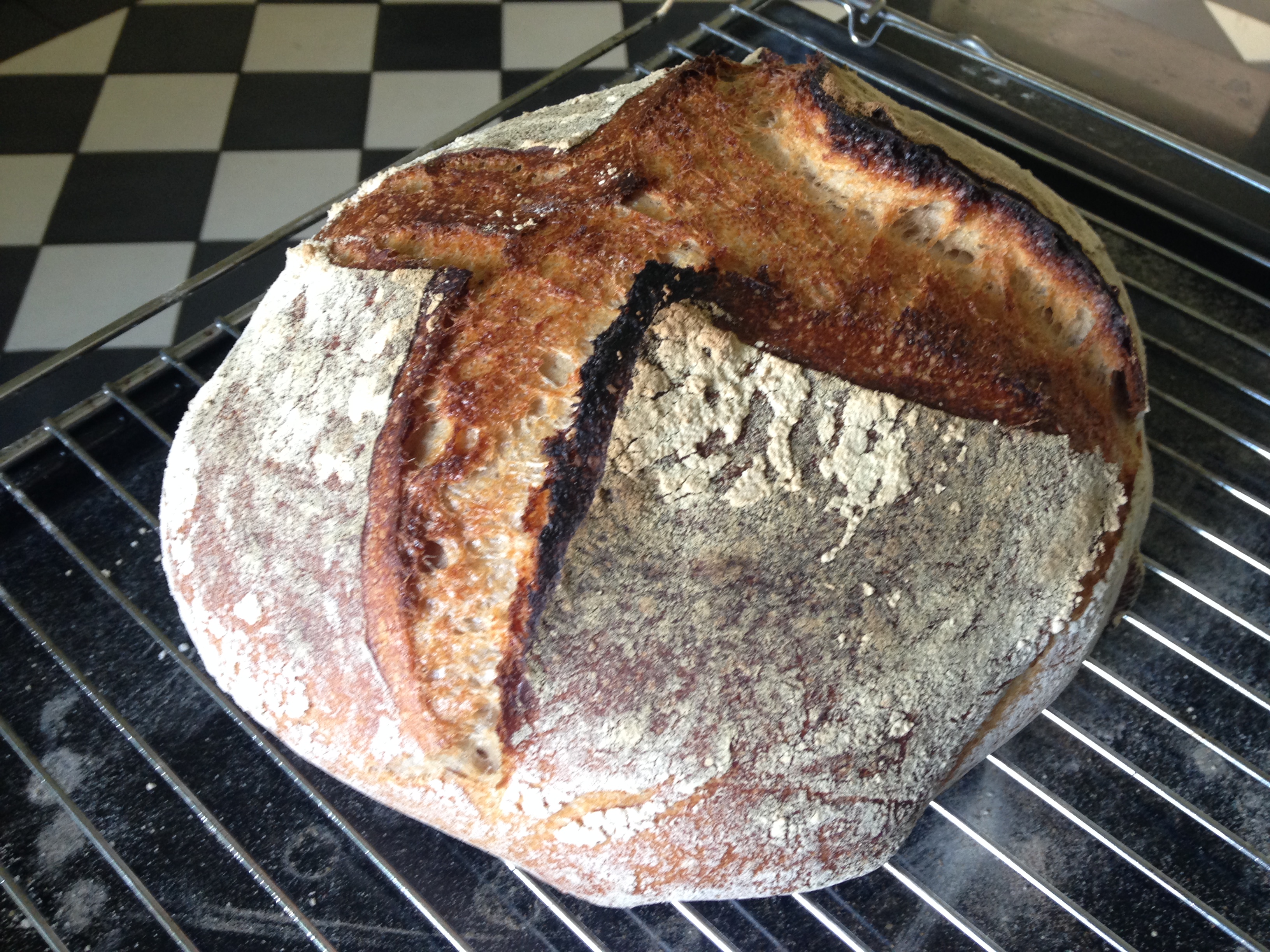 3085Ik heb nu 75% patentbloem en 25% tarwebloem gebruikt, hydratatie 75%. Desem starter 50% roggemeel en 50% T150 meel, hydratatie 100%. Onder en bovenwarmte op bakplaat met bakpapier. Beviel mij beter als de dutch oven.