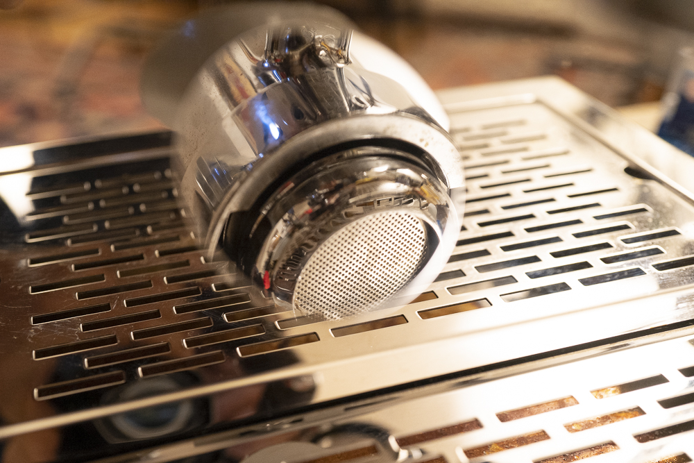 Dan zodra de bodem van het filterbakje vol droppels hangt doorschuiven naar 5 bar en de hefboom omhoog zodat een ferme extractie: