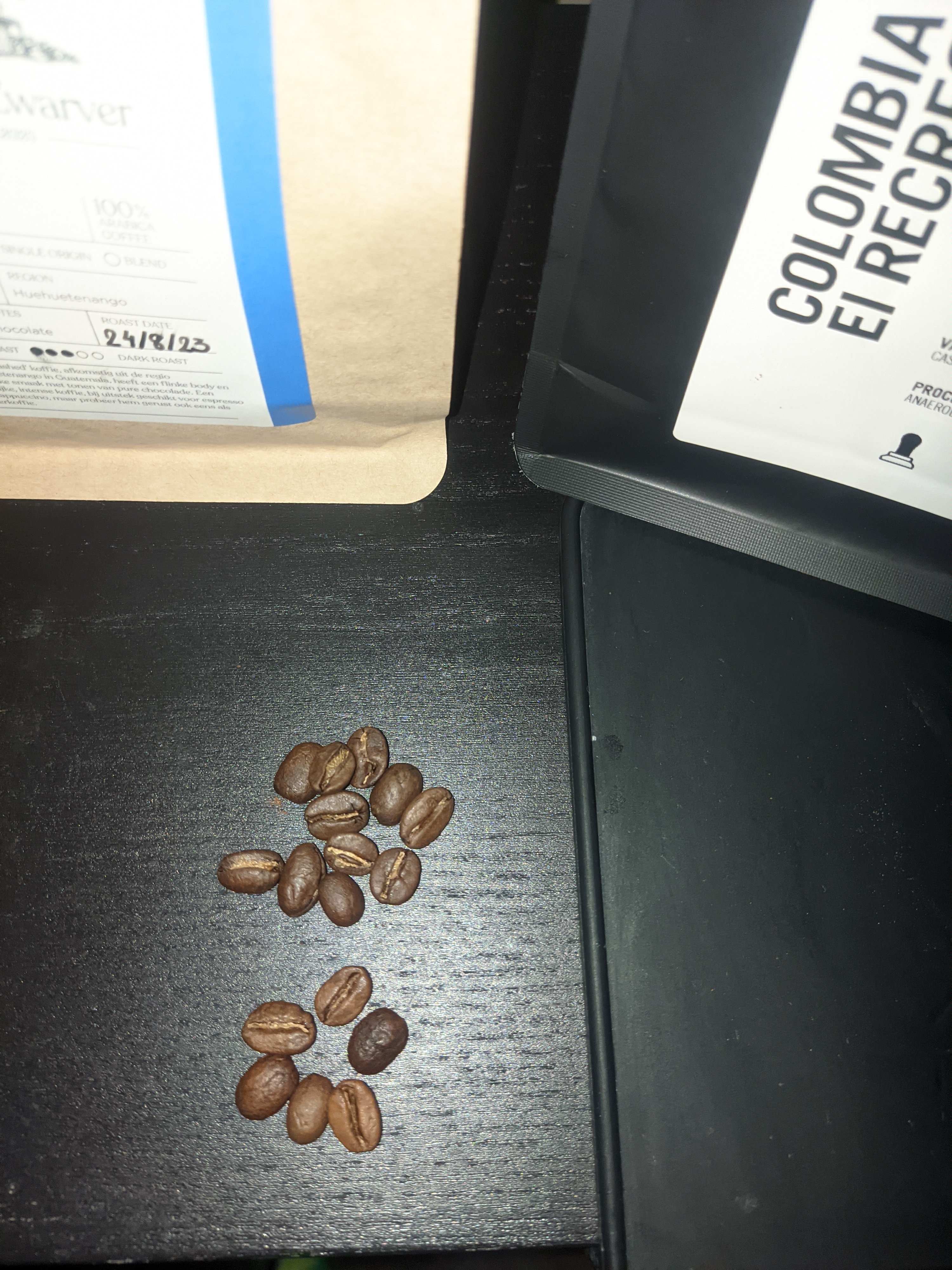 Afgelopen woensdag vergeten de koffie bij het hoofdkwartier te bestellen, komt die morgen pas net gebrand. Kwam ik dit weekend ineens een kraampje tegen op de boerenmarkt in Elspeet. Vers gebrande bonen van een redelijk nieuwe brander d'olde zwarver in Kampen. Ik kon nog niets over ze vinden, dus ik zeg er zelf maar eens wat over. :) Brandprofiel heeft op de site op elke boon medium staan, en zo ziet en smaakt het ook. In de afbeelding boven wat bonen van Blommers te zien. Op het eerste gezicht ziet het er consistent gebrand uit, weinig uitschieters in bonen.