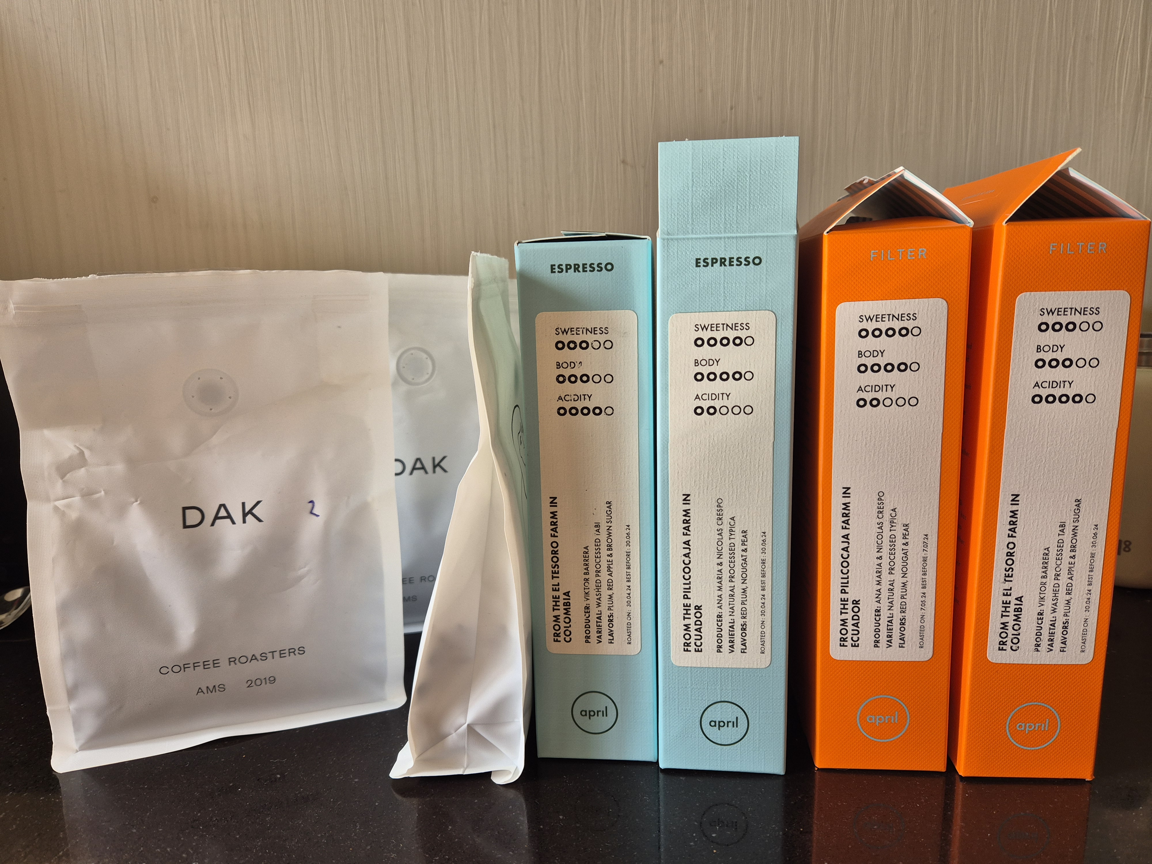 Op dit moment wat funky bonen van DAK, de Watermelon drops en Milky Cake voor espresso en de Pear Fizz voor filter. Eerste keer dat ik er besteld heb en bevalt me wel goed. En mijn nieuwe abonnement van April Coffee Roasters uit Kopenhagen is net binnen.