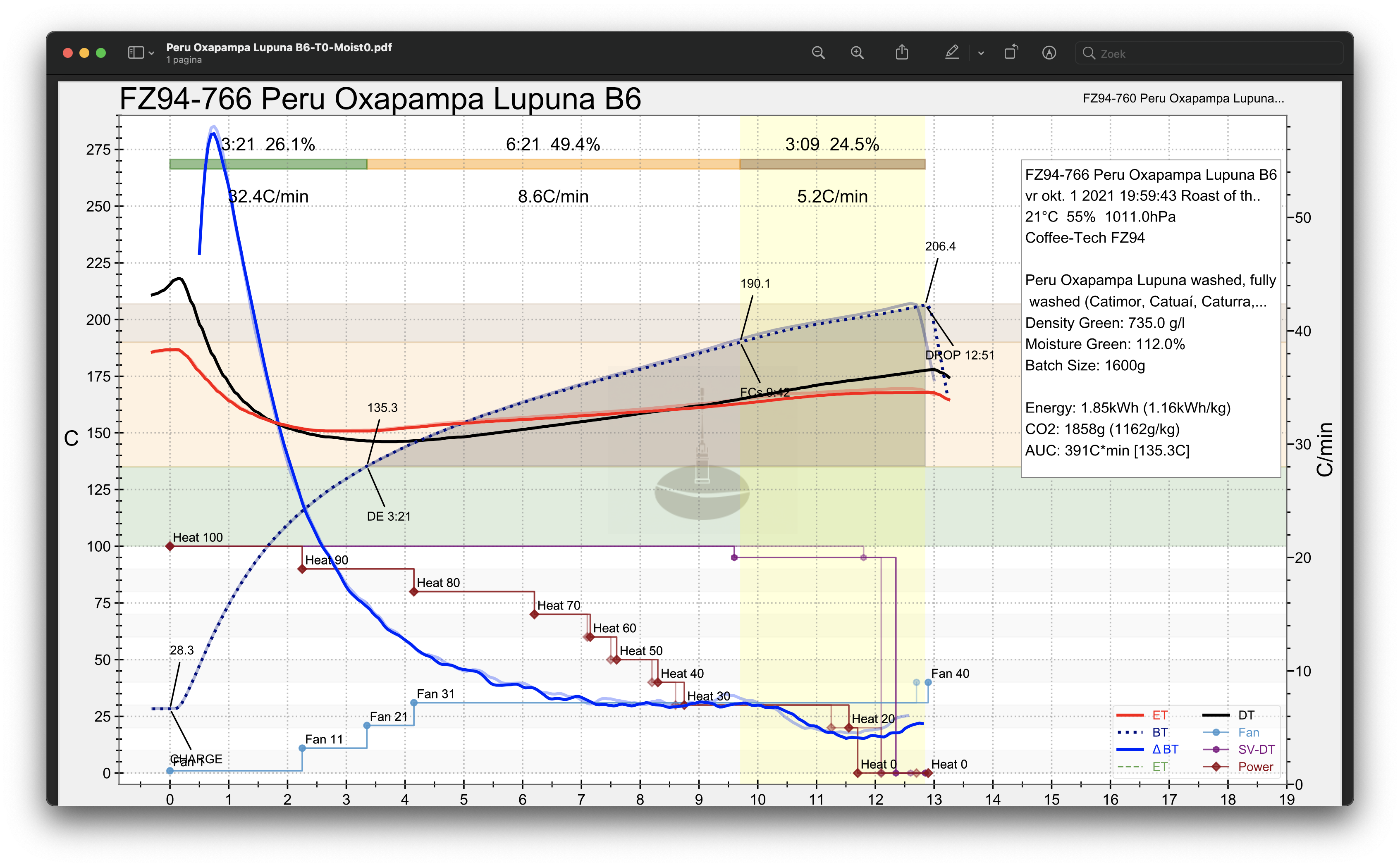 Gegevens over gewicht voor/na ontbreken? AUC is ook niet vermeld/bijgehouden? Ontwikkelfase loopt bij jou (waarom) tot rond 235ºC? FC viel niet samen met de verwachte FC, waarom niet aangepast in "phases"? Op eenderde van ontwikkelfase loopt RoR omlaag tot onder de 3ºC/min wat ik (misschien onterecht) als minimum aanhoud. Wat veroorzaakte dat?