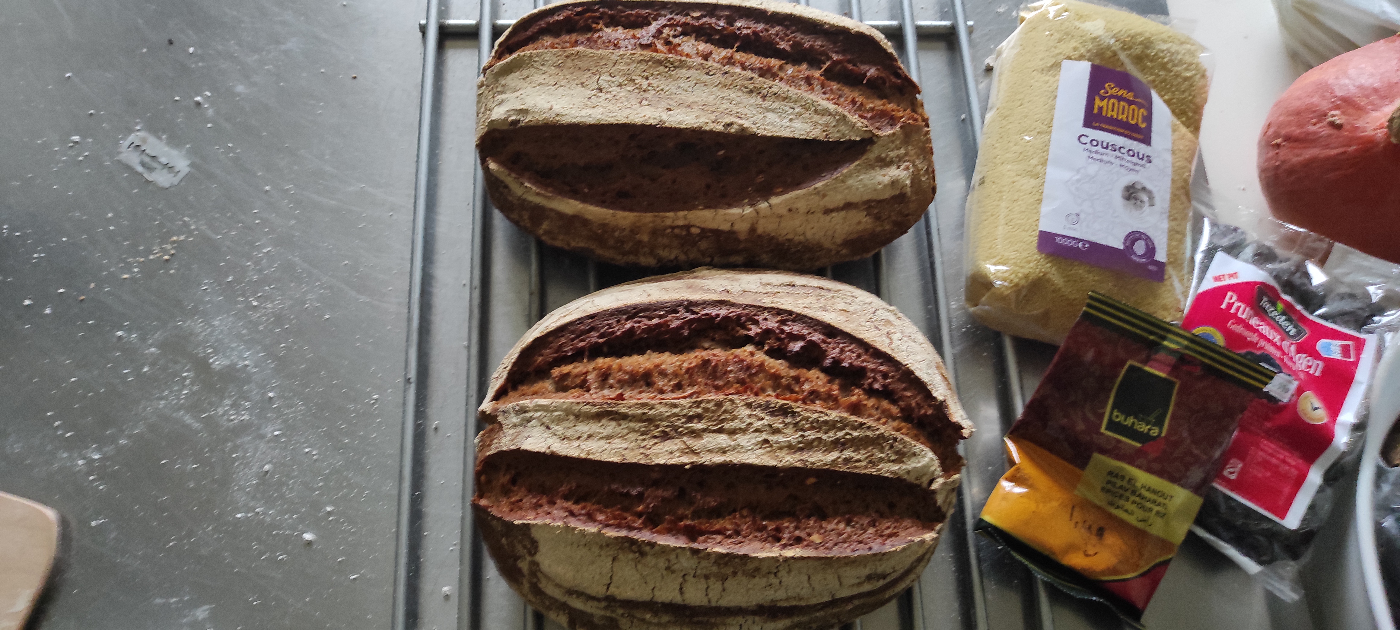Niks gewogen dus verhoudingen ken ik niet.Maar schat 60% rogge.Hydratatie ongeveer 72%.