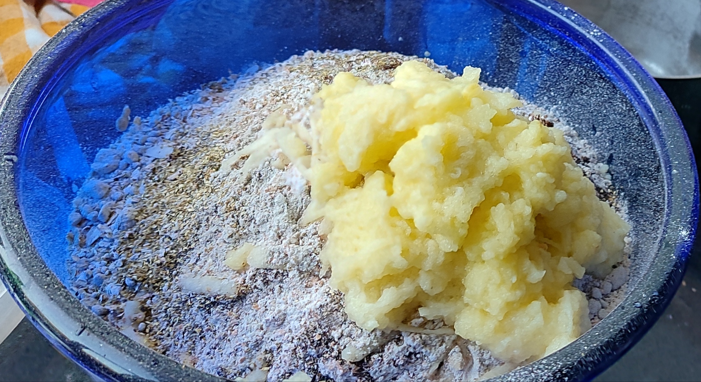 5891En vandaag weer een sodabrood gemaakt. Niet helemaal gelukt dit keer. Ik denk dat dat komt omdat ik nu minder vocht heb gebruikt. Normaal stop ik er 250 cc karnemelk en 300 cc water, nu 250 gram karnemelk en 150 gram water. Er ging minder water omdat de midden-binnen-bovenkant van het brood altijd wat klef bleef. Om uit te proberen.... Niet meer doen.